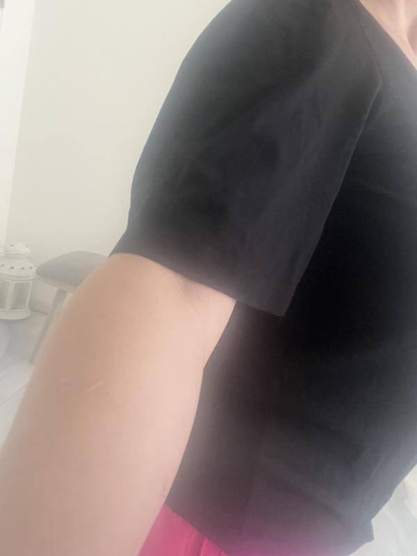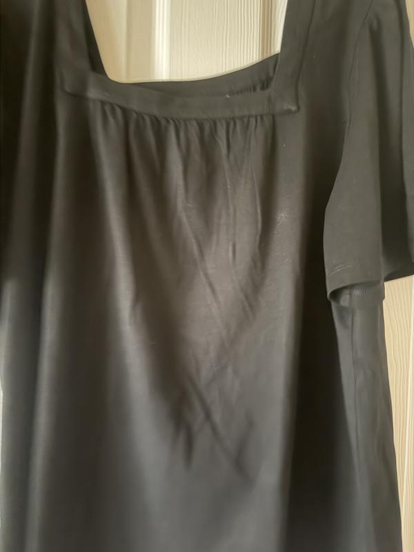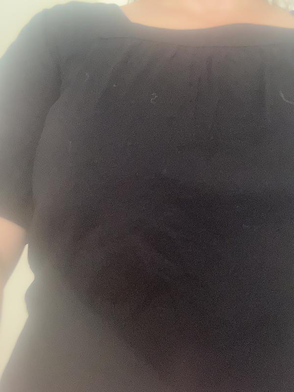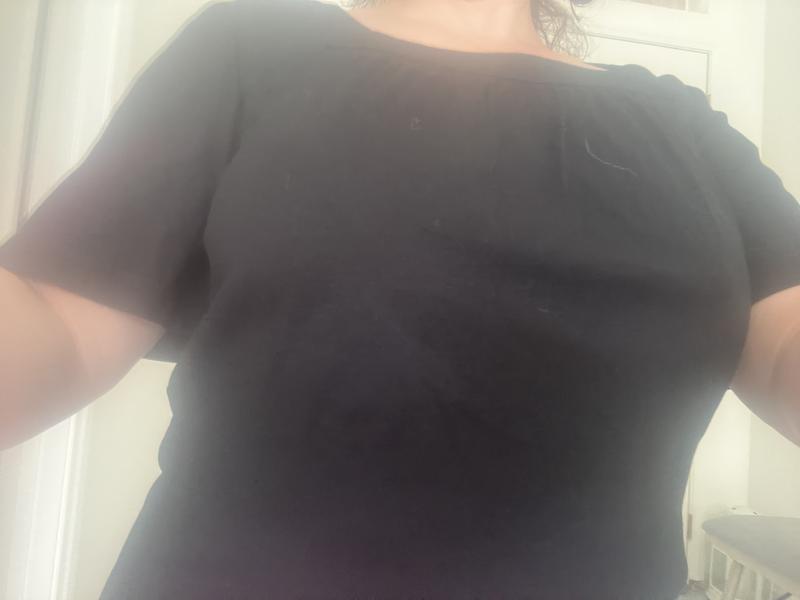This top is black and very open on the top. It’s great for the Summertime. Casual for work. It sort of a boxy neck line which is ok. I like the fluttery sleeves. It’s a soft cotton with attractive fit. I’m usually a medium, but the XS fit well with a 38C, which was surprising. Pretty good overall and comfortable fit.