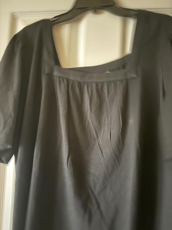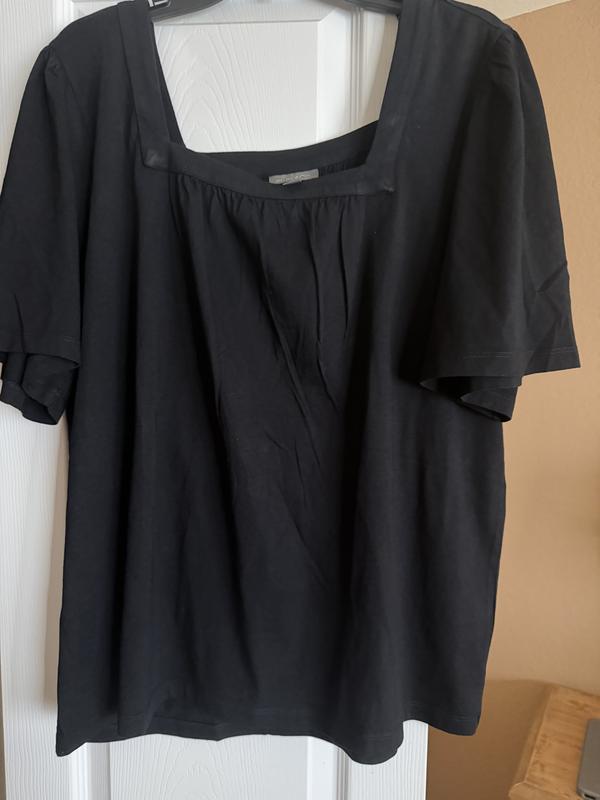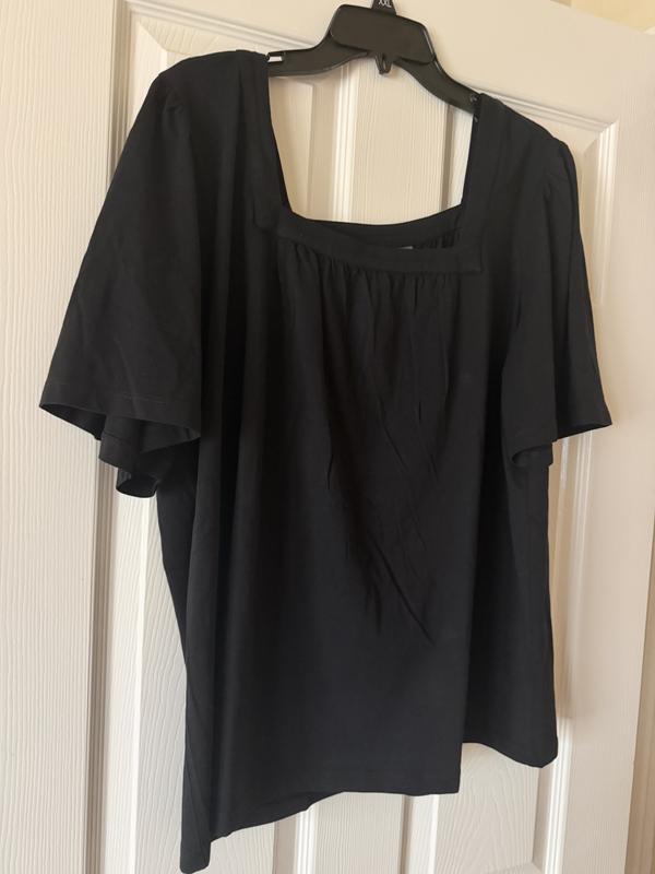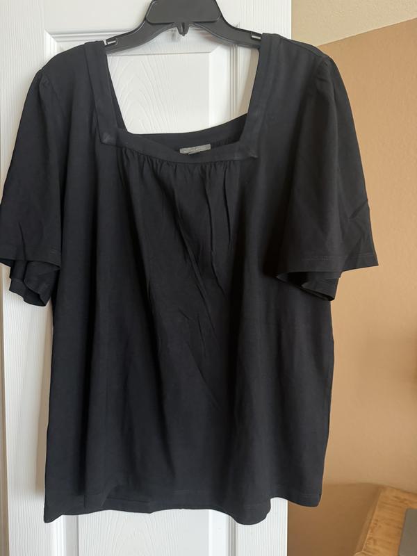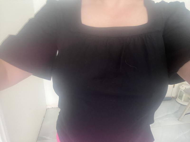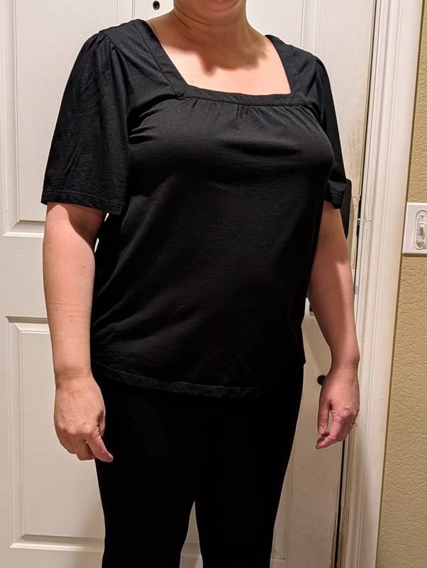 This short flutter sleeve top is very comfortable. I like that the style is loose and flowy. I really like the sleeve length, as they cover my upper arm flab. The square neck makes the top look nicer than the average t-shirt. I was worried that my bra straps would show with this cut, but the top covers them perfectly. I got this in black and the color is a true black. Runs true to size. I gave this top 4 stars because it wrinkled so much in the dryer.