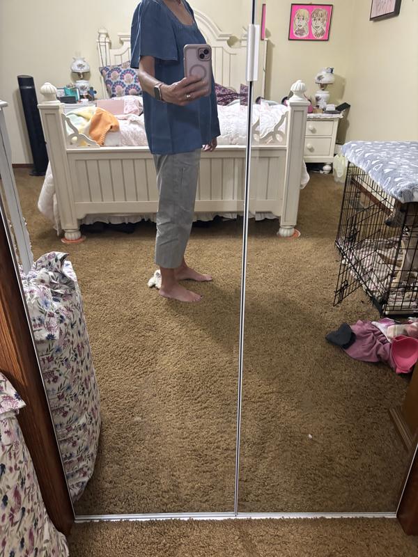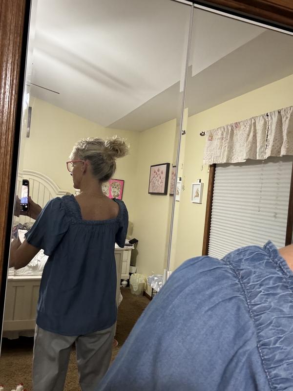 Surprisingly great fit! I actually ordered the denim in this style. I’m busty and don’t like to show cleavage and this top was surprisingly awesome in fit without compromising modesty!