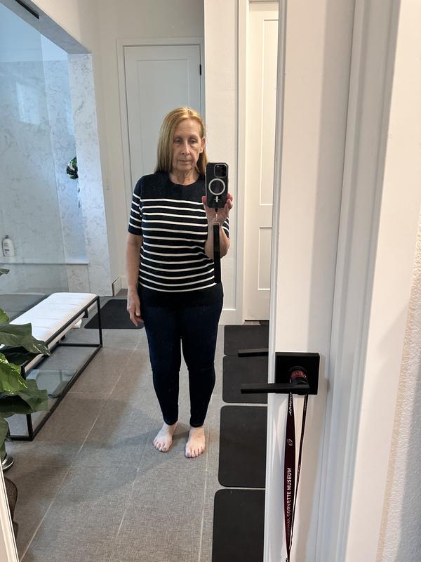 This is a classic sweater. It’s mid weight and the stripes line up nicely. I’m typically a size 6-8 in tops and the small fit well. The length hit too long for my personal preference at 5’4”. If the fabric blend contained cotton instead of acrylic, it would be 5 stars.