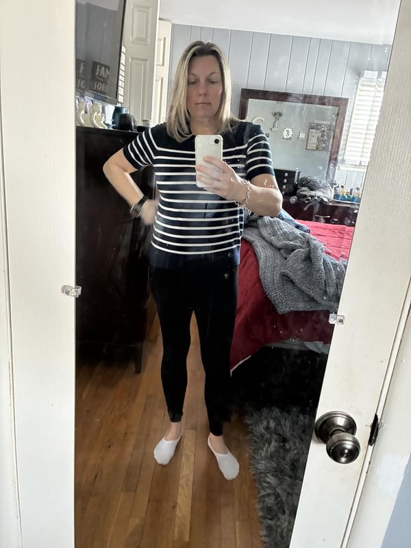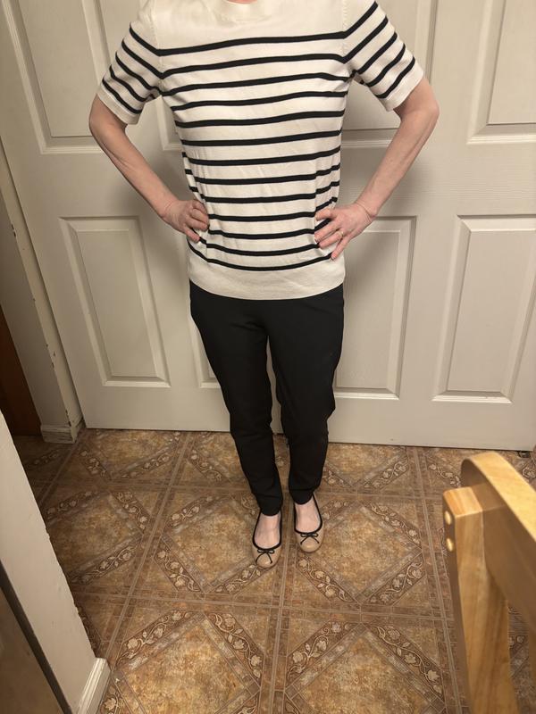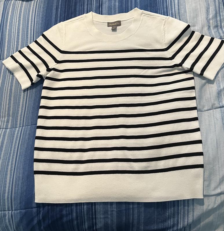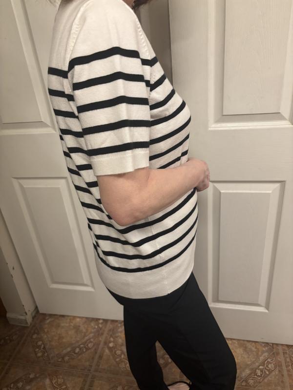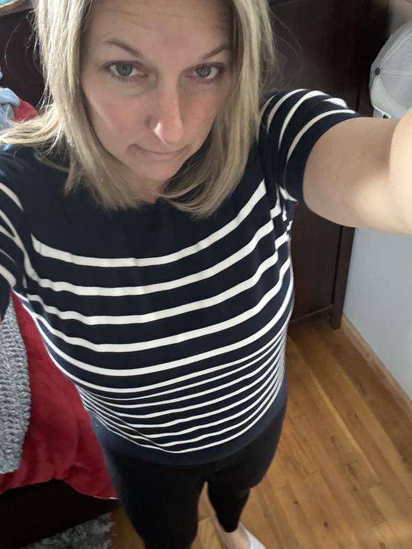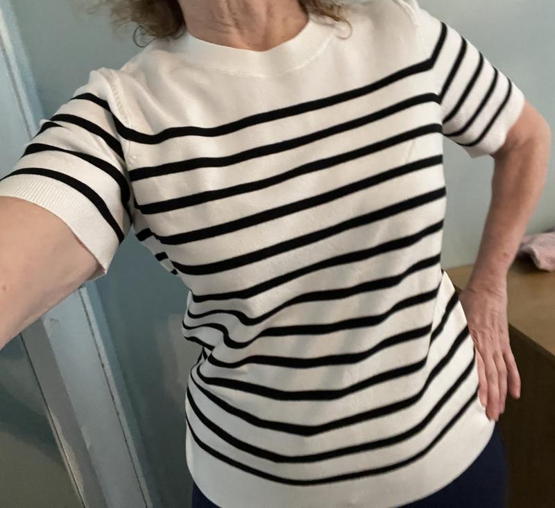 I’m typically a PS or reg XS depending on the cut. ( For reference I’m 5’3” 114 lbs.) I ordered S and the cut is generous. However I did wash it and it shrank a little and now fits better. Like Princess Kate, I’ve always had an affinity for the Breton Stripe. It’s nautical, preppy yet still looks current. The cotton fabric is soft and came out nicely in the wash. Just be careful and wash and dry gently if you want to avoid shrinkage. I consider this a basic sweater, suitable for work. The black stripes are a nice departure from the typical navy and looks fresh, perfect for Spring/Summer!