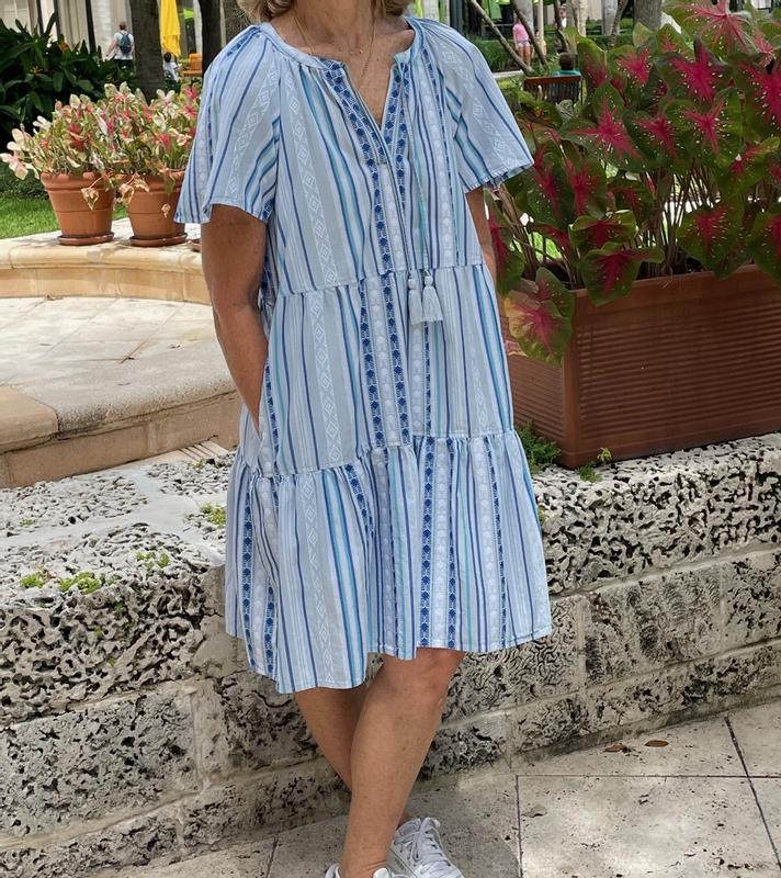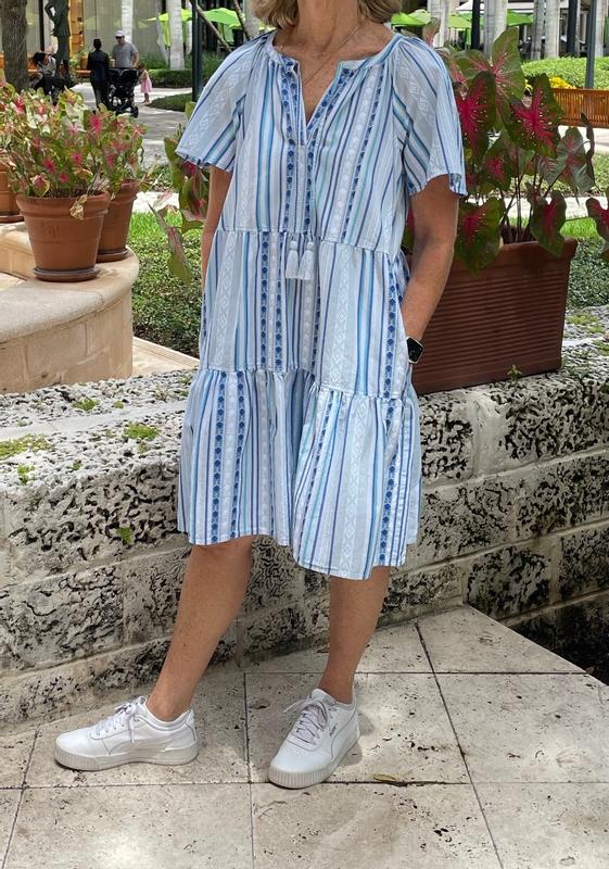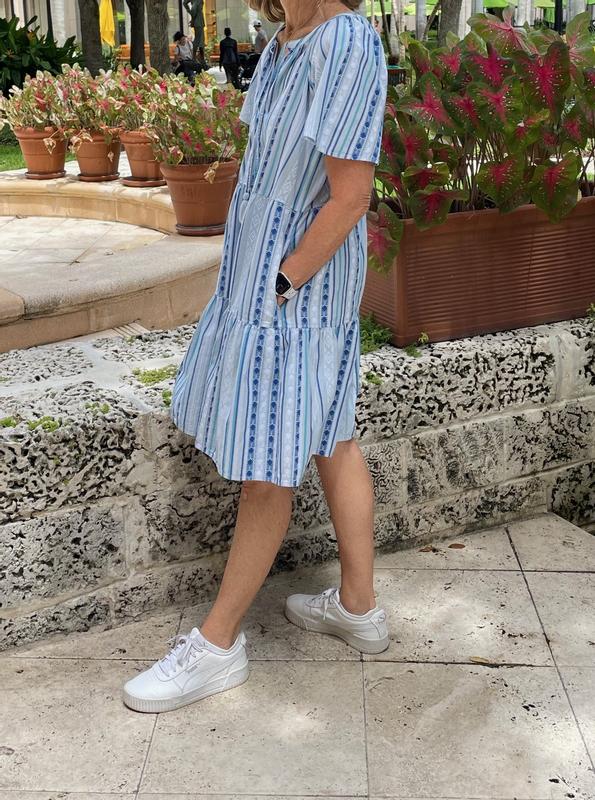 This dress is so cute. Not overly voluminous, size is accurate. Not too short. Comfy go to for a cruise I’ll be taking.