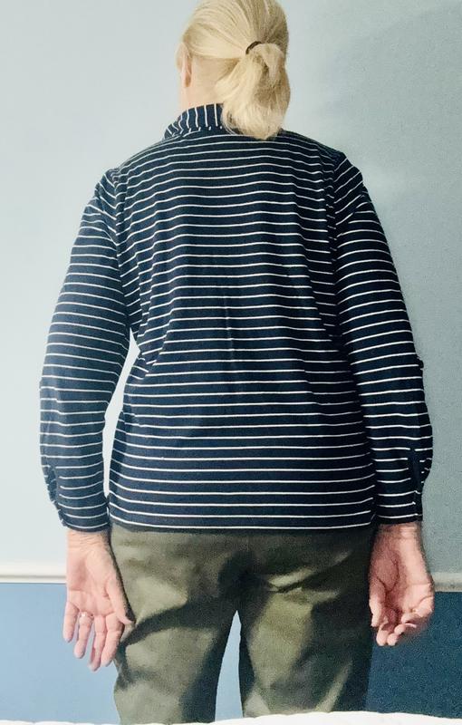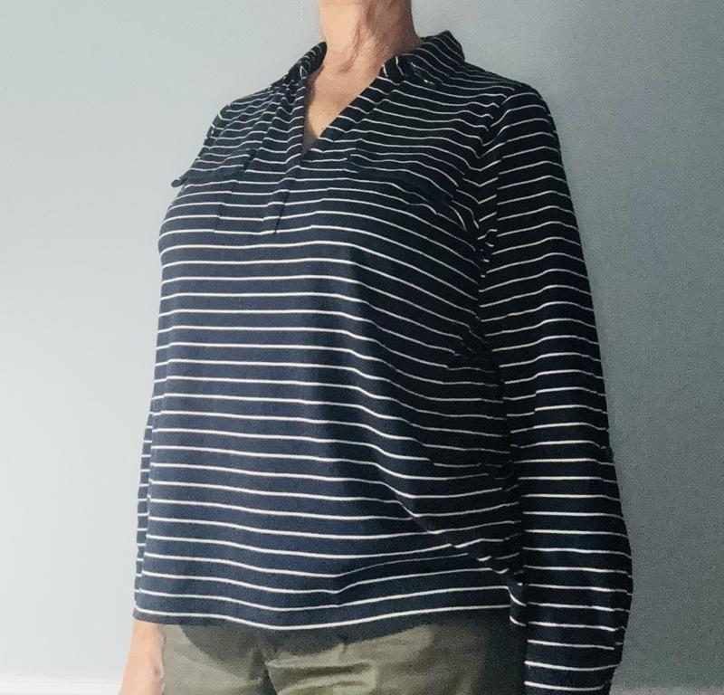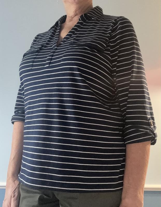 Nice casual wear top. Very comfortable The fabric has a nice soft feel to it. The sleeves length is good and have tabs to allow them to be rolled up and held in place. The top washed up very well and no ironing was needed. It packed well on a recent trip and I anticipate packing it again for an upcoming cruise. It layers nicely with a Jean jacket or sweater. The downside is it it slightly shorter in length than I prefer and is boxy looking.