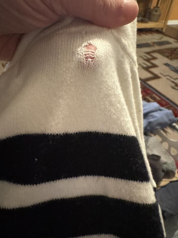 Nice sweater. Love the feel very soft. Had a little flaw but can live with it.