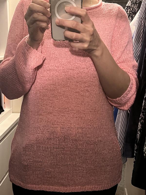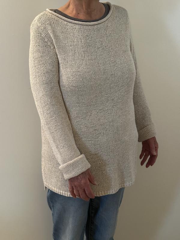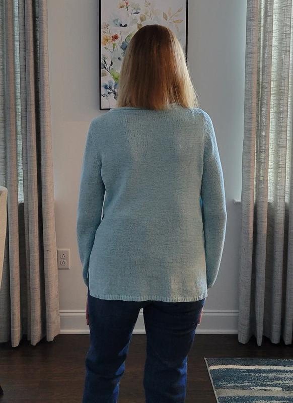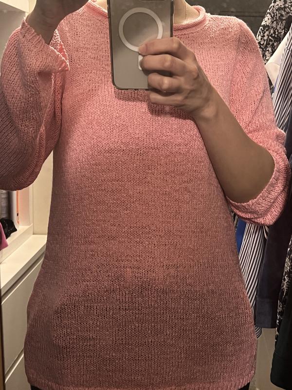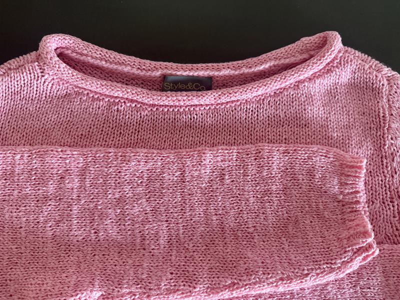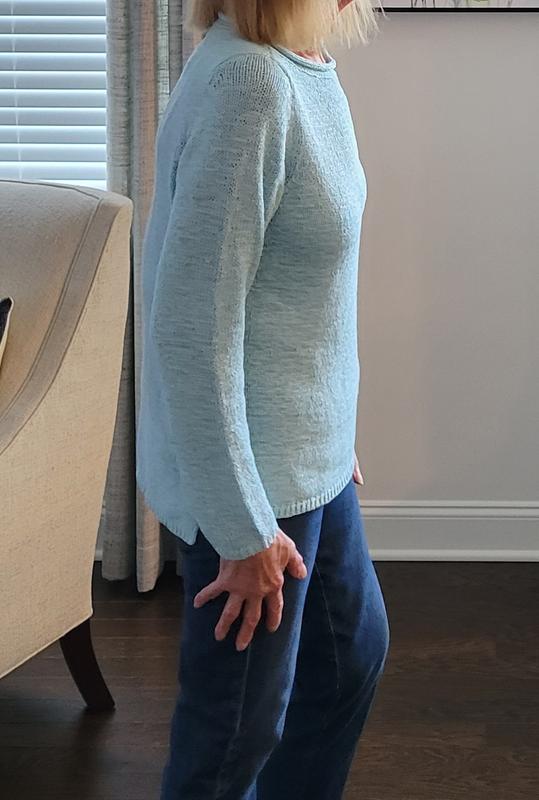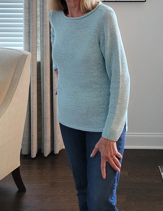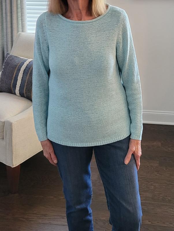 Lightweight long sleeve pullover top in a beautiful color. Length is good as I am 5' 8" tall along with the sleeve length. Fabric is just a little scratchy(reason for 4 stars) and I will probably wear a tank or tee shirt under it for that reason along with blocking air flow for warmth as it is a loose knit top and a big stretchy. I am wearing a size small which fits well as Style & Co. tops tend to run big. over all happy with product