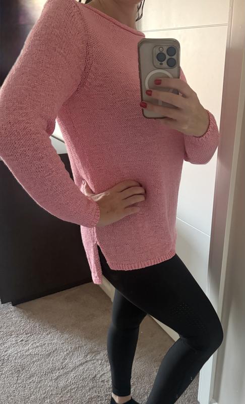 Beautiful soft pink color. Very comfy looking style, looks great with leggings. There are small slits in the sides and the back is a little longer than the front. Roll neck gives a dressier look. The only reason I took one start - it is not as soft as it looks.
