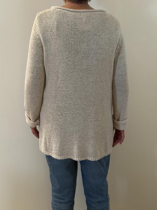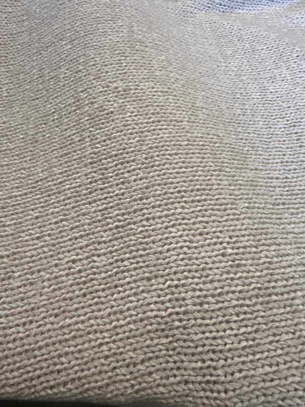 Yarn knit sweater that runs big. I’d recommend sizing down. Nice casual sweater that can also be dressed up. Can see through the yarn knit, so best worn over a tank or shirt. Is machine washable, but best to wash in a protective laundry bag to avoid snags.
