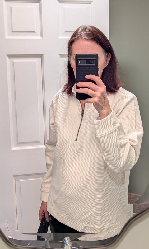 I sized up and it happens to be a great looser fit. The material is good quality. It is a great layer piece. I ordered the black one, so I can combine it with all sorts of bottoms. My go to are jeans and a tee.