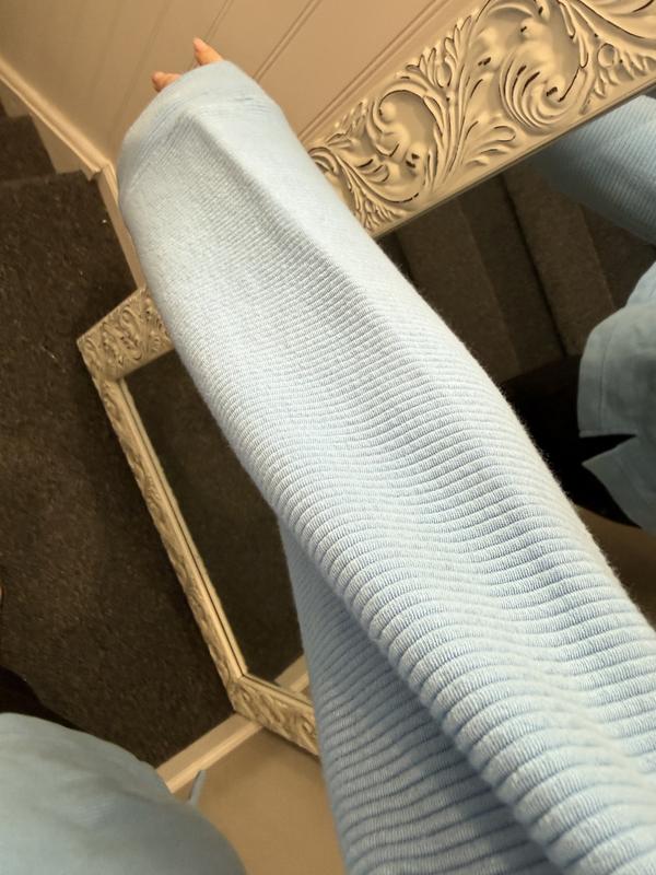 Very nice top, can be dressed up or down. Soft and really pretty deep light blue color. Not too warm, just right.