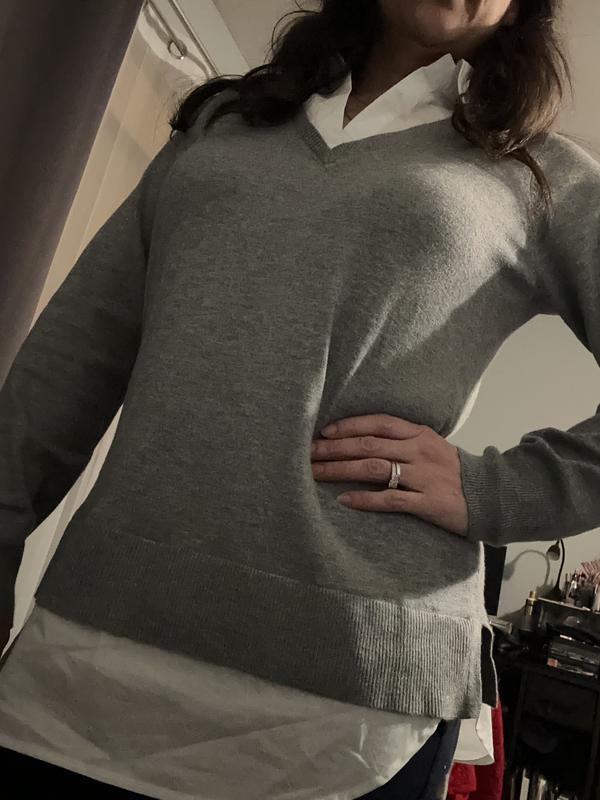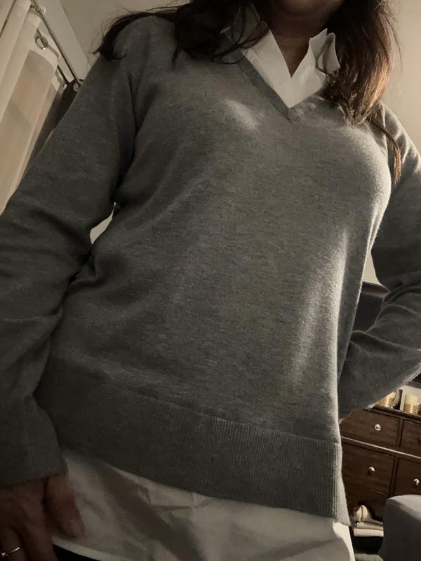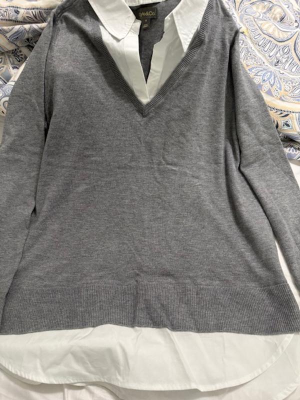 I am a real fan of the two-fer style, and this Style & Co Sweater has a lot going for it. First, it is true to size to slightly generous, which I appreciate. It doesn't feel loose, but it also is forgiving in not hugging the body. Second, the color is attractive (I got the blue), and I think it will go with a lot (jeans, slacks, even a straight skirt). Third, I like the weight of the sweater because it doesn't feel overly bulky or hot, which can be nice for transitioning into different seasons. What I'm not sure about is the blouse portions of the top and how wrinkly they might get. The material is rather thin, and even the top looked nice when it arrived, I felt like I had to iron the collar and bottom. I'm also not sure how "attracted" the sweater might be to pet and human hair, so I will keep a lint roller nearby :).
