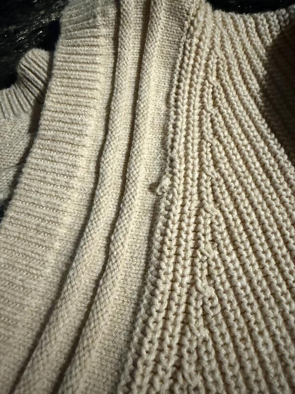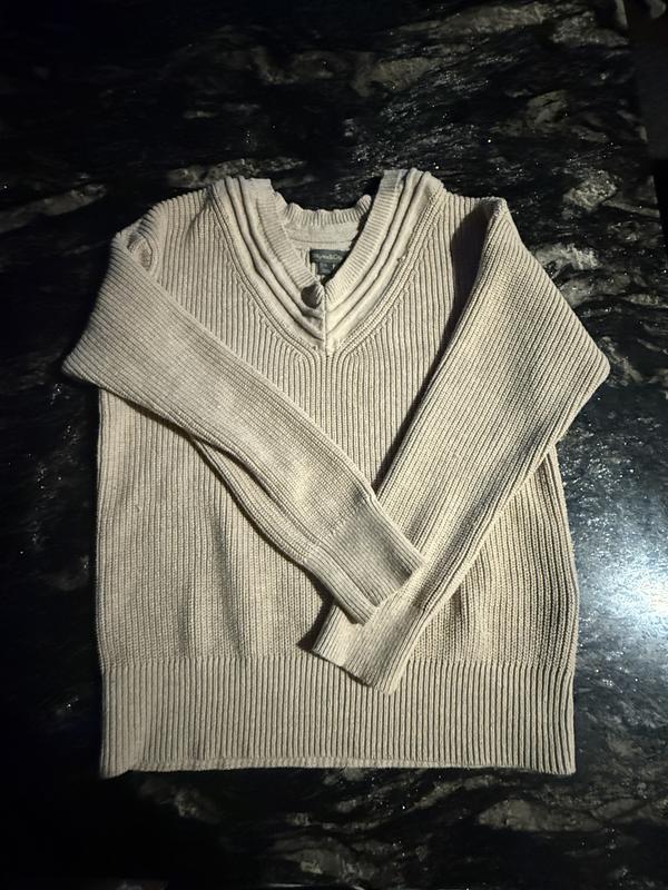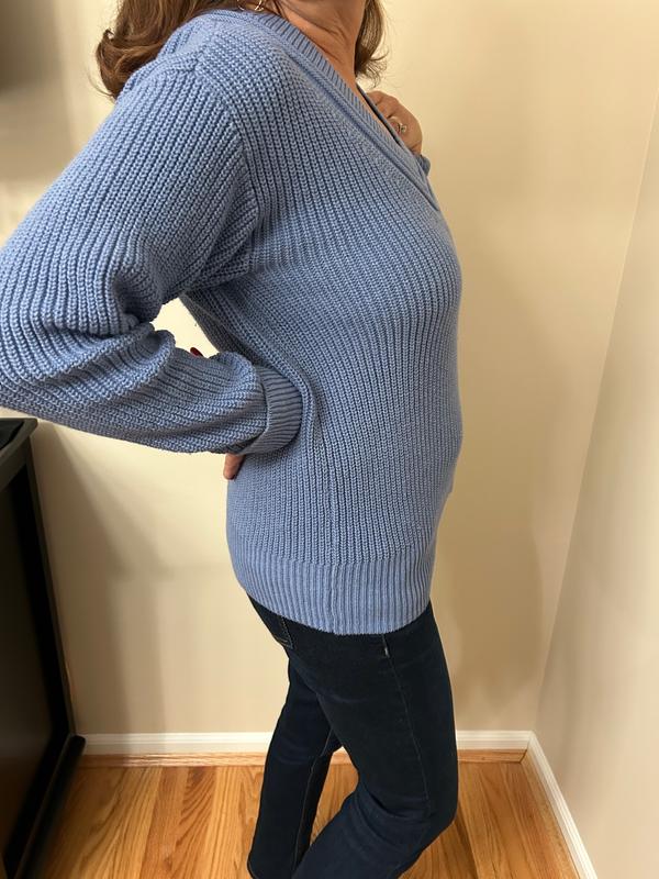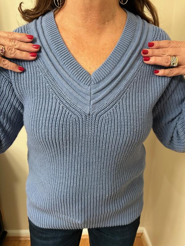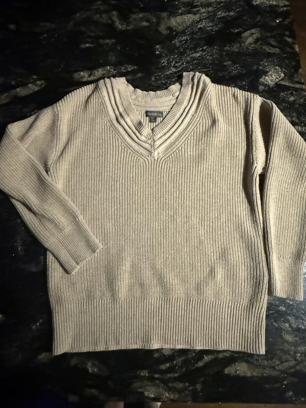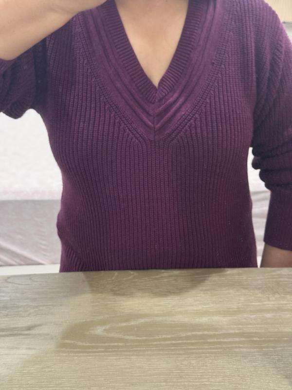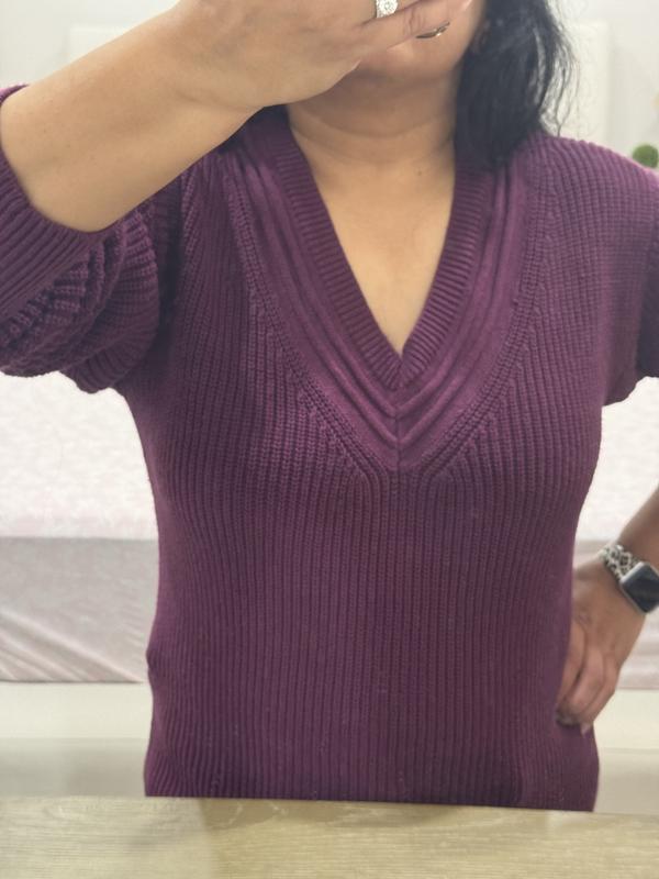 This sweater will probably be a wardrobe staple. Nothing special, but fits well and is comfortable. I had to return the regular size for a Petite because the sleeves were very long—- overtook the rest of the sweater.