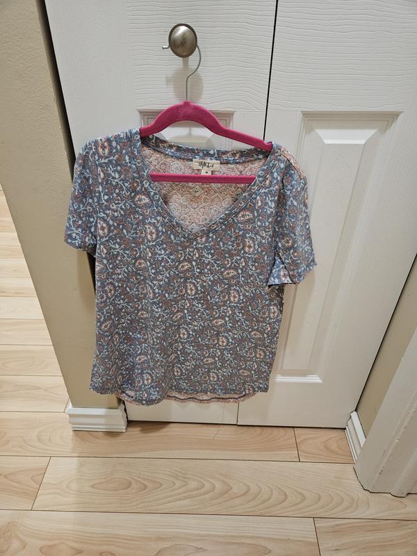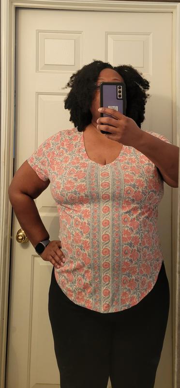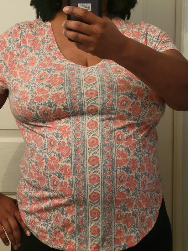 Love this t shirt! Great fit. So comfortable! True to size. Bought in two colors. Wish they came in more colors.