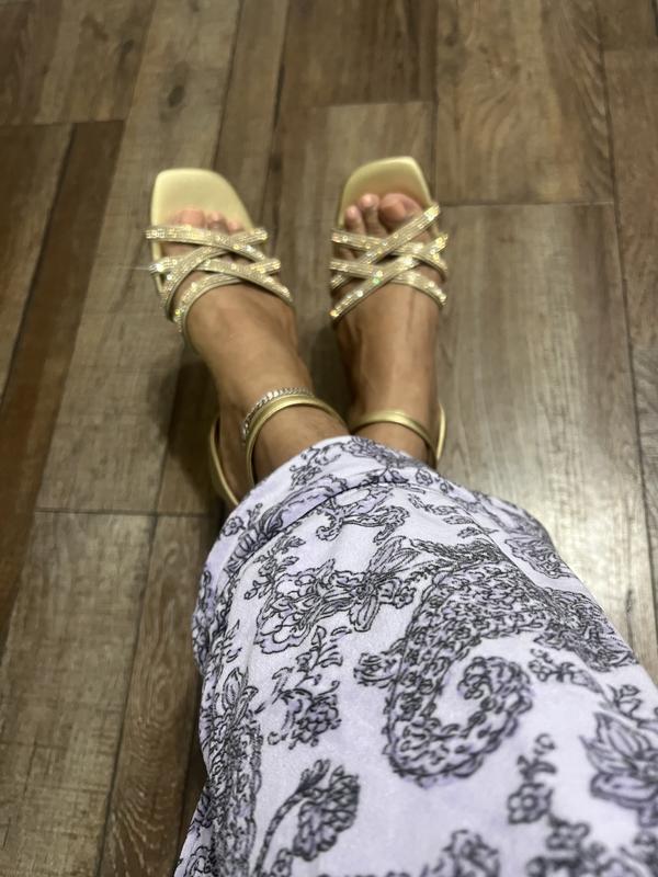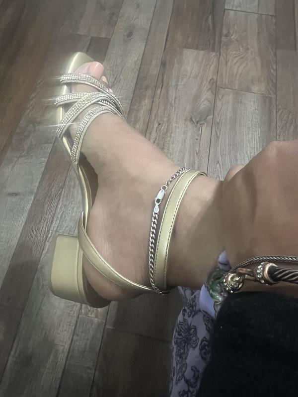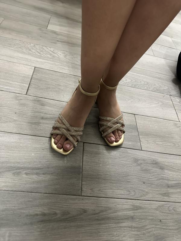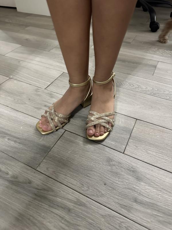 Cute gold little heels with rhinestones, perfect for any occasion. They seem comfortable and fits True to size and perfect for thin feet as it doesn’t allow most your toes to slide out. Perfect heel size for a preteen or someone that can wear high heels.
