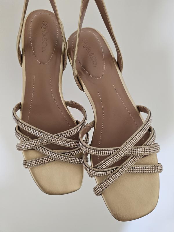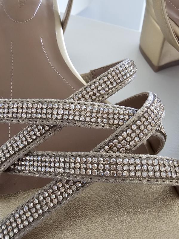 These dress shoes are surprisingly comfy. It has a padded heel and the height is just right. The ankle strap has plenty of adjustable holes. The gold color is not too shiny. I like the rhinestones. It's just the right amount of bling to make it look dressy. Only negative about these shoes, is that i received a pair with missing rhinestones. Not too noticeable unless you really look close.