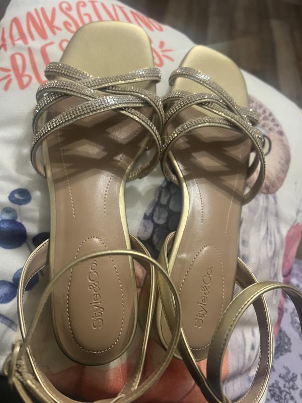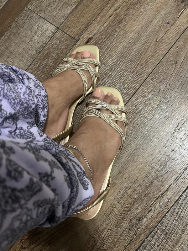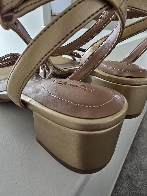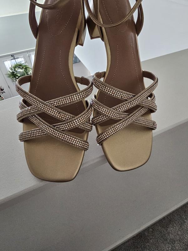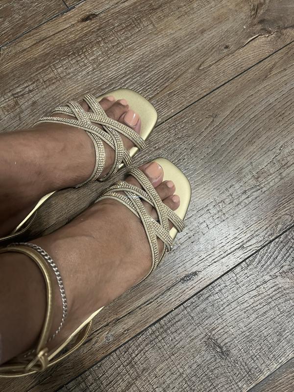 Pretty gold sandals with low heel, look more expensive than they are, comfotable fancy strappy with ankle strap, good for party season with skirts, dresses or even jeans, the gold is a good color not fake looking