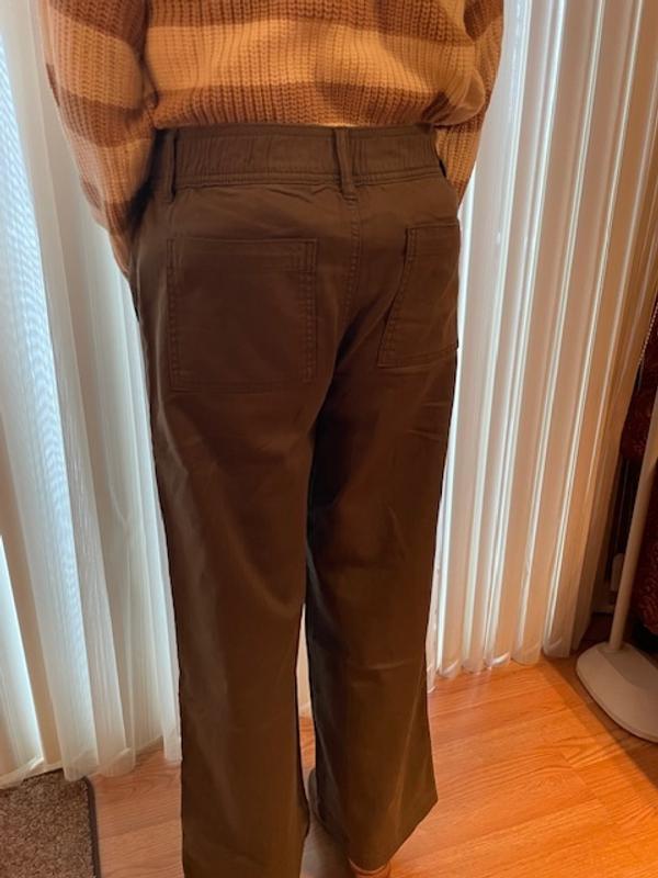 Love these pants. They are a perfect fit. I purchased size 8, and they fit exactly like a size 8. There is some elastic on the back of the waistband, which makes them extra comfortable but does not cause a pooch in the backside. The slant pockets in front are nice and roomy, and the back pockets are handy. The cotton/lyocell/spandex blend fabric makes a sturdy jean with a very soft feel.