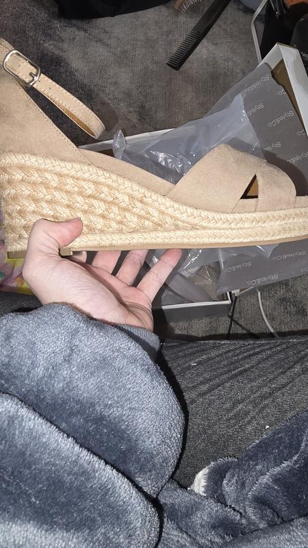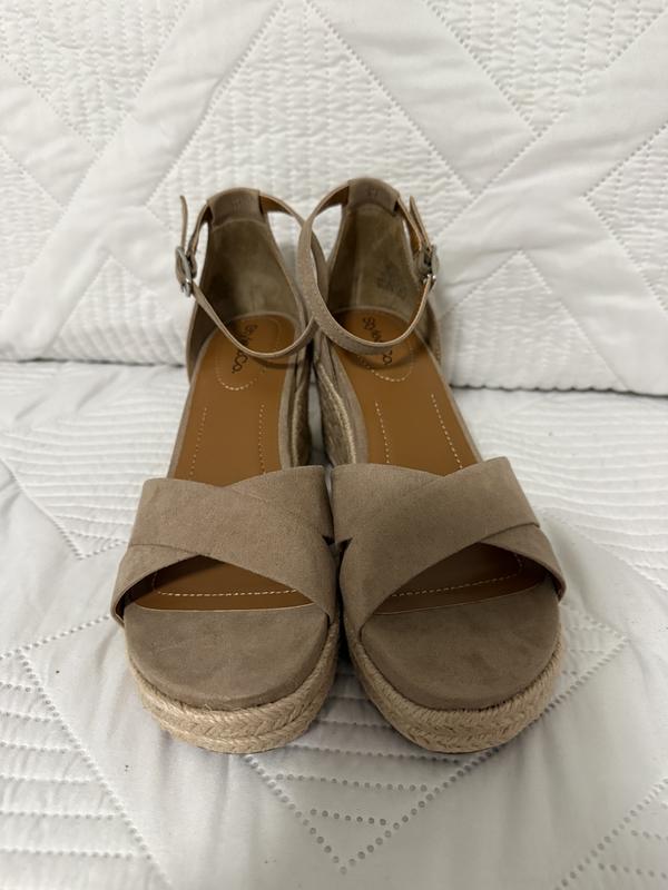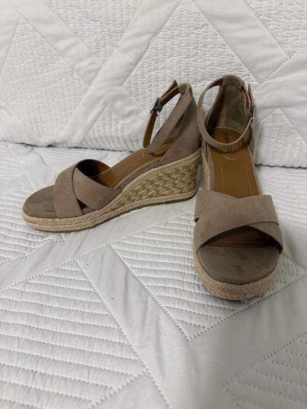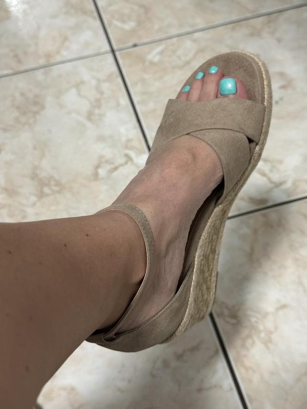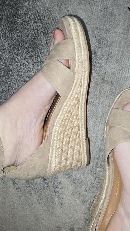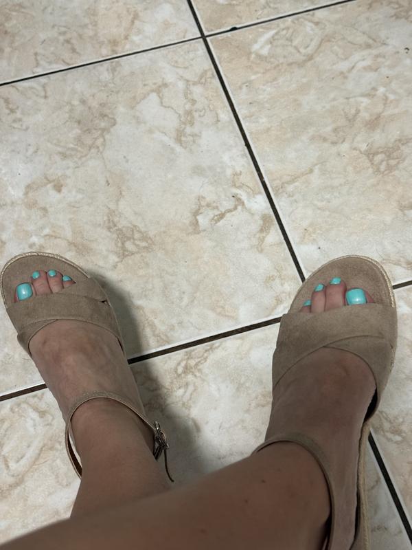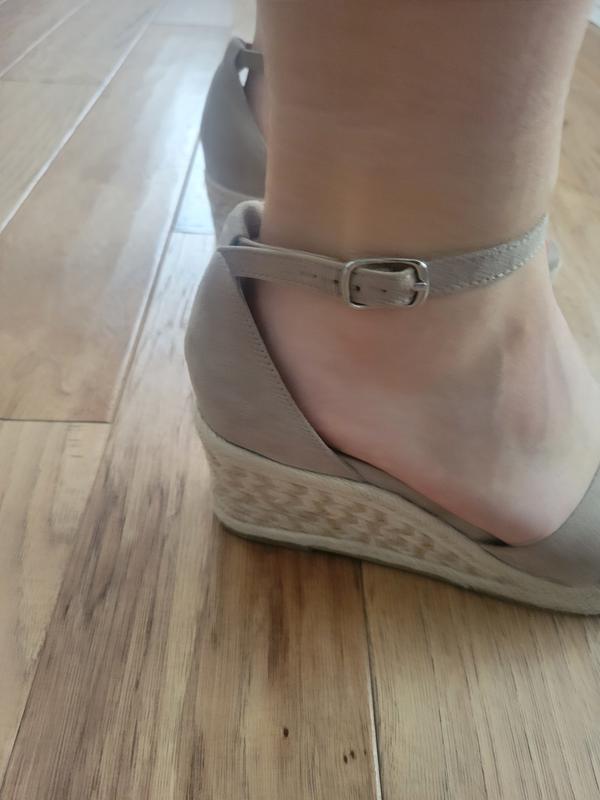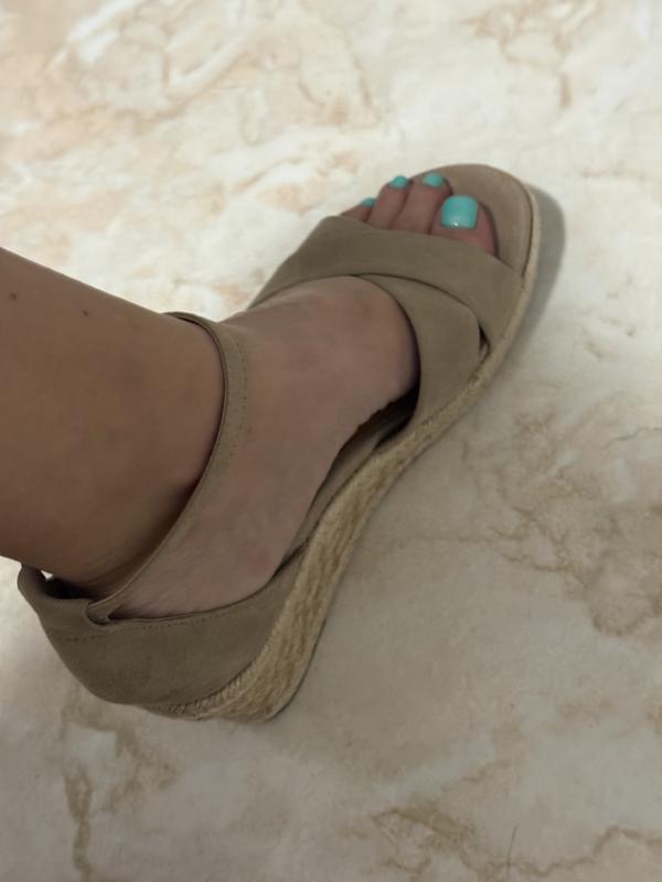 These are very cute summer wedge sandal that are dressier than a flip flop or low sandal and look great with a summer dress. I usually wear a 7 and sometimes 7 wide, I got these in a regular 7 and they fit fine. I would even say they run on the bigger size. The straps are a brushed suede feel fabric that is tan and the heel is a twine look fabric. They feel cushiony when I first put them on. I measured the heel to be about 3 inches which is a tad high for me for everyday wear, but it looks great with a maxi dress. The adjustable ankle strap makes them feel more secure and I feel like it helps me when walking in shoes this height.