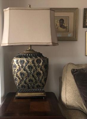 The lamp is beautiful and perfect for the space I placed it in. I was worried that it would be too large and overwhelming for the space, but is enhances the end table and sofa with it's rich looking base and shade. I love it, it worked out better than I expected.