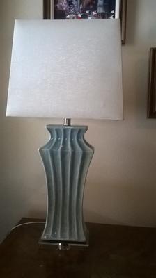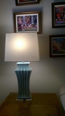Love the look of this lamp. However the blue is a bit more light blue than aqua when turned on. Also the lamp sits on a base of solid clear glass. When it arrived it was no longer centered so I had to move the lamp to the center (had to hit one side against table doesn't move easily).