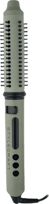 Elevate your hair styling routine with the premium ceramic barrel two-in-one Retractable Styling Brush & Curling Wand. Transform your hair into a masterpiece with this innovative styling tool, featuring a 1.25" premium ceramic barrel infused with nourishing keratin, argan and coconut oils. Experience ultimate smoothness and a radiant shine as these essential oils work magic on every strand. Designed for efficiency, this tool uses advanced nano-silver and tourmaline technology to release negative ions, seal cuticles, lock in moisture and reduce frizz. Say goodbye to dull, lifeless hair and hello to healthier, hydrated locks with enhanced shine. With fast and even heating powered by MCH technology, you'll enjoy quick heat-up times and consistent heat distribution, ensuring your curls last all day. Choose from five customizable temperature settings ranging from 300°F to 410°F, complete with LED indicators, allowing you to tailor the heat to suit your hair type for optimal styling results. Experience a smooth styling process with the retractable switch that releases hair instantly without pulling or snagging. Create perfect curls effortlessly every time. The user-friendly design includes a 9-ft. power cable with a 360° swivel, ensuring maximum convenience. The heat-resistant cool tip provides extra protection, comfort and control, making it a joy to use. Upgrade your hair styling experience with this premium curling iron, where innovation meets beauty for stunning, lasting results!