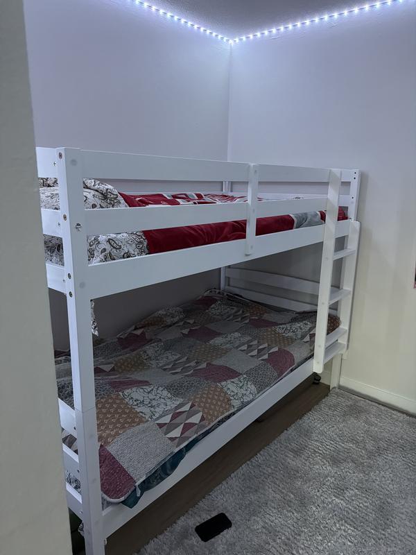 Web ID: 19214910The SUGIFT Solid Wood Twin Over Twin Bunk Bed combines durability, versatility, and safety to create the perfect solution for growing families. Constructed from a solid wood frame and supported by 14+14 wooden slats, this bunk bed offers exceptional stability and can support up to 350 lbs on both the top and bottom beds. Its convertible design allows you to easily separate the bunk into two freestanding twin beds or a single bed and daybed, catering to your family's evolving needs. The bunk bed features 12" full-length guardrails for all-around protection and a securely mounted 3-step ladder for easy access to the upper bed. An anti-tilting anchor provides added stability when the bed is set against the wall, making it ideal for families with children. With a 12" clearance under the bed, you have ample storage space for suitcases, boxes, or toys, making it a space-saving solution for kid's rooms and guest rooms.
