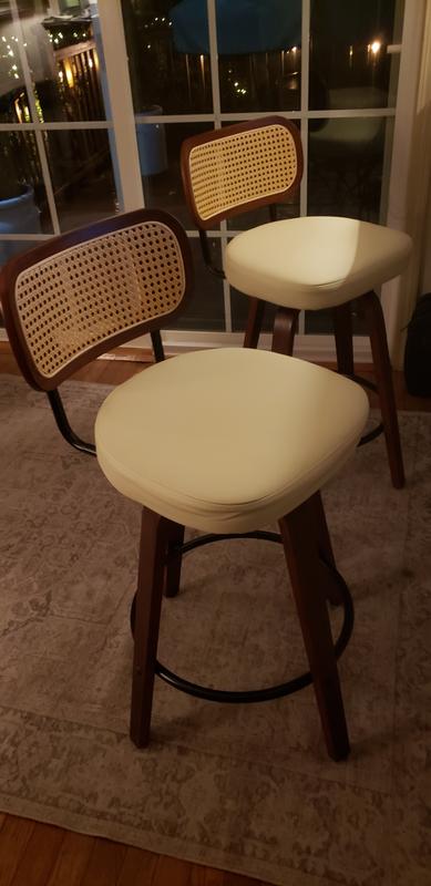 Elevate your seating experience with this 360° swivel stool featuring a ventilated cane backrest that encourages airflow and posture-friendly support. Its curved walnut wood frame offers a refined aesthetic with lasting strength. Whether placed at a kitchen island, home bar, or guest area, the smooth swivel motion and timeless natural elements create a relaxed yet functional seating solution that fits seamlessly into any environment.