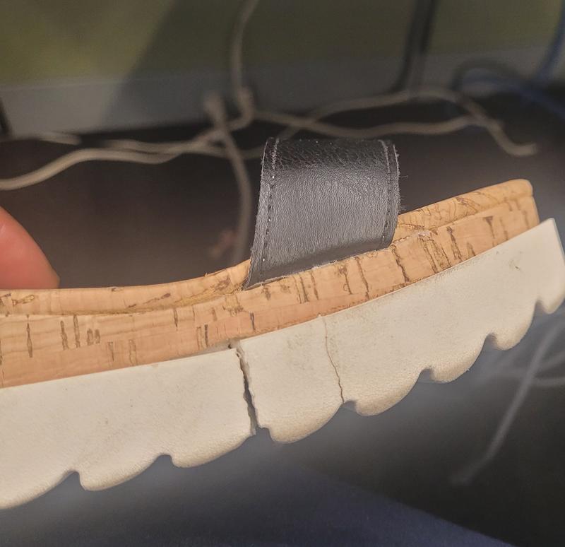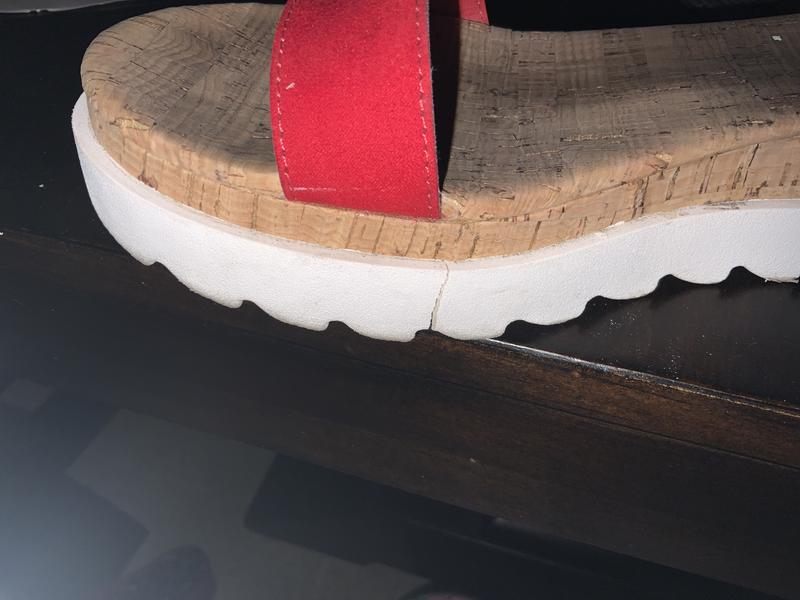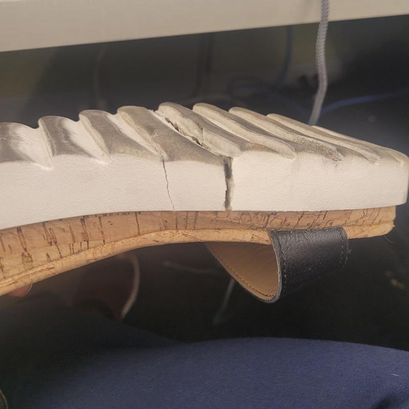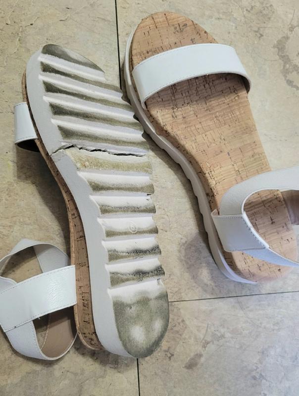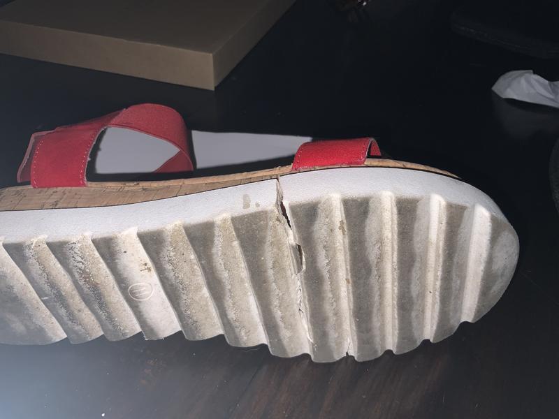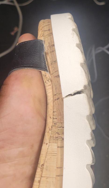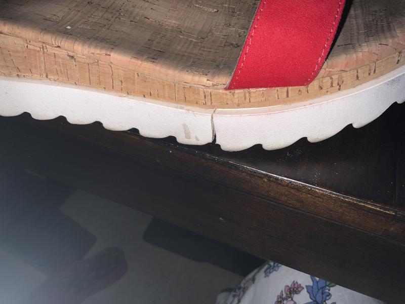 I wore these shoes for the first time on an airplane travel day. By the end of the day, the white bottom of both shoes was cracked where the ball of you foot moves when walking. They both cracked all the way up to the cork bottom of the shoe. I only wore these shoes one time and I'm very disappointed that they broke on the first wear.