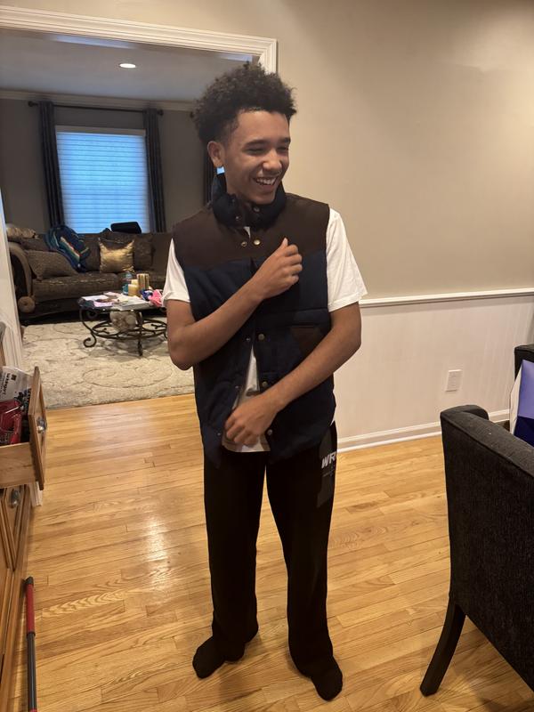 Sun + Stone's Maddux vest is a stylish cool weather outerwear piece with corduroy trim, a two-tone design and a fully lined body.