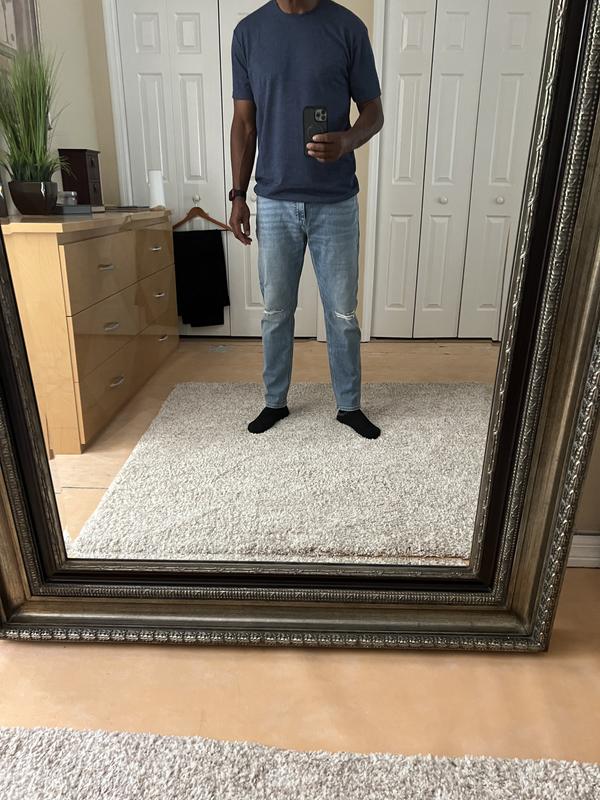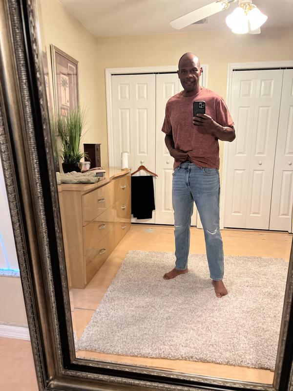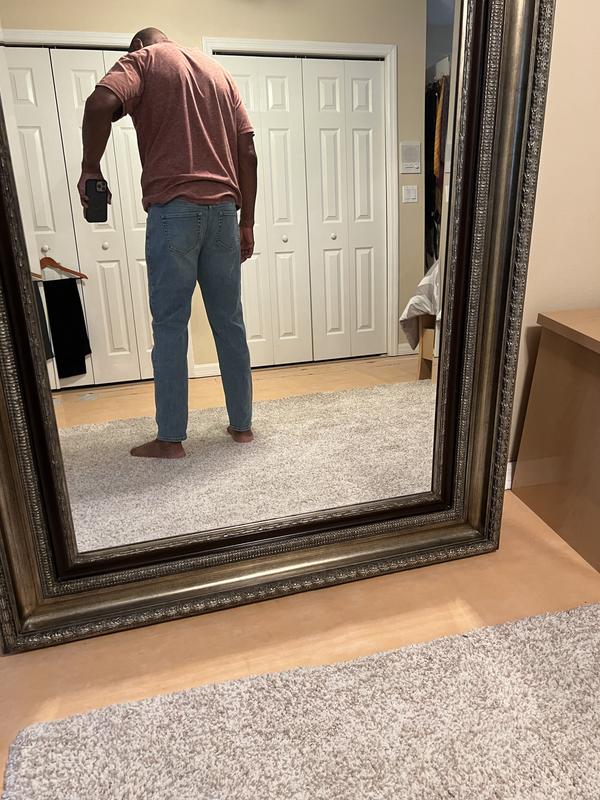 I really like the jeans, but my thighs are a little too big for these. I’m 6’, 191lbs, size 33 waist. Waist was perfect but the seat and thighs were too snug. Not the jeans fault because they are advertised as slim fit, unfortunately, they’re more like skinny jeans on me. I got the 32” length and they still seemed a little short. Shorter than most 32” length jeans I’ve bought. Too bad because I liked the distressed look and stretch feel. A really good value for what you get.