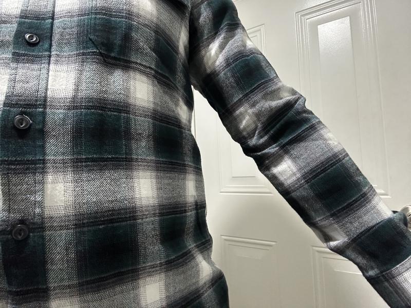 I bit heavier weight flannel which is good for those cold days. Detailing is nicely finished. Colors are a bit more subdued than in the photo, with the red not as bright (which gives a quieter look).