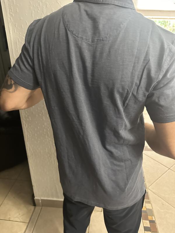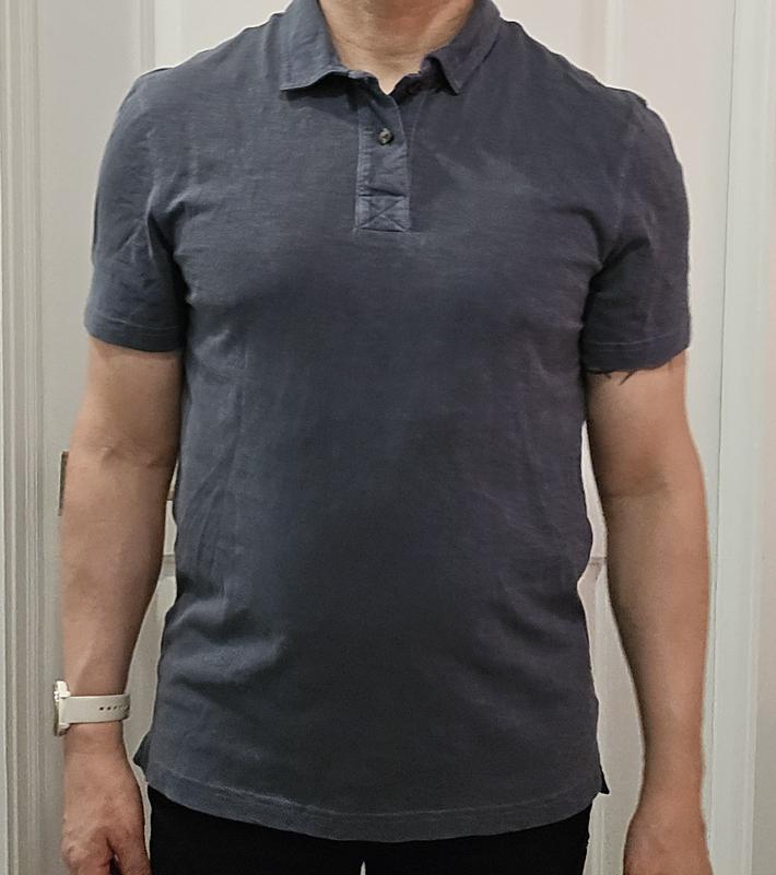 Color is spot on. Feels comfortable. The fit is true to size, although the length is a little short. The collar and buttons do not fit right. The "look" is off.