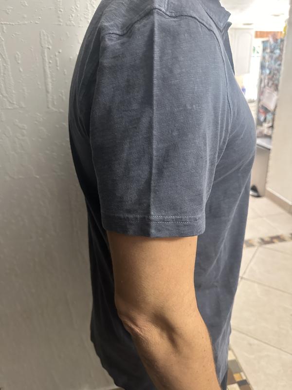 I bought this shirt for my son and he loved the weight and feel of it. It is soft cotton and looks great. The only reason I gave it 4 stars is because it shrunk a little bit when I washed. My son complained of it being a little short, otherwise he loves it.