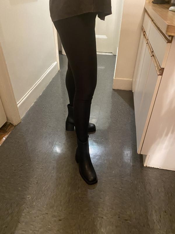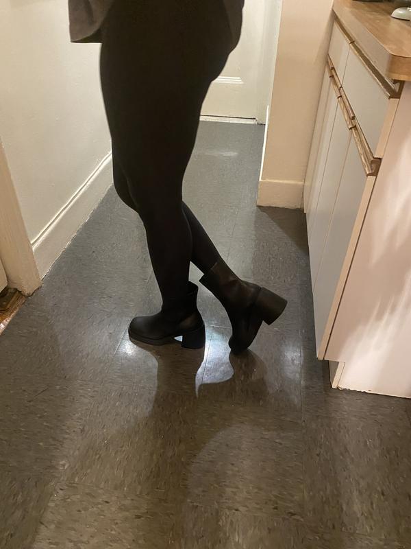 Looks just like the photos. Makes my legs looks slimmer and longer. They’re very comfortable and the heel size is perfect for someone who don’t wear high heels! Love that it has enough space to move around with them below the calf.