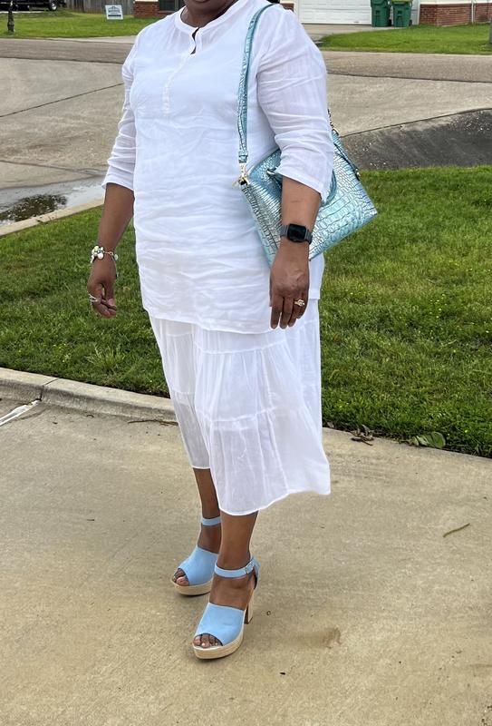 I really like this espadrille platform sandal from Sun + Stone. I find it very comfortable and love the extra height it gives me. The strap across the front of the foot is not too tight and the ankle strap holds your foot securely. These can be worn casual or dressy. You won't go wrong with them!