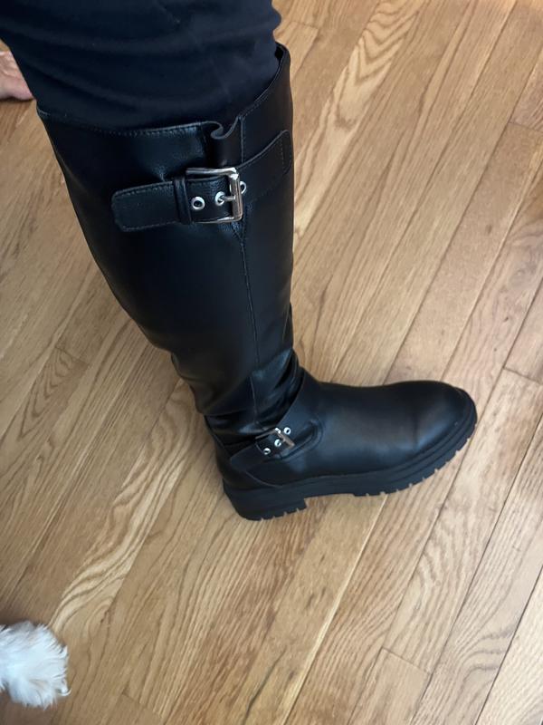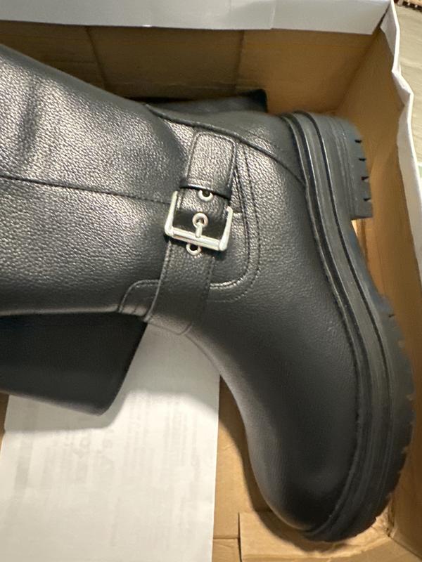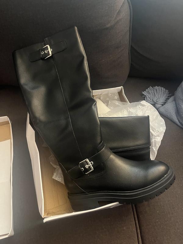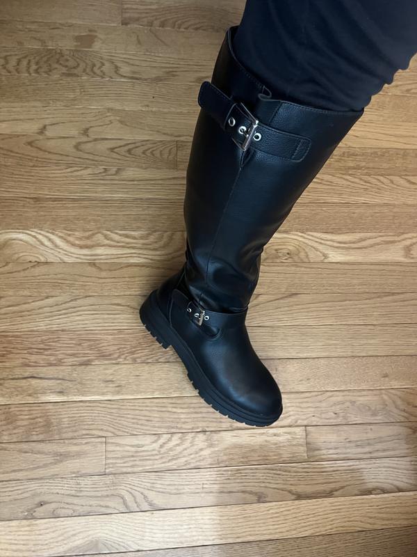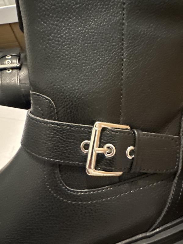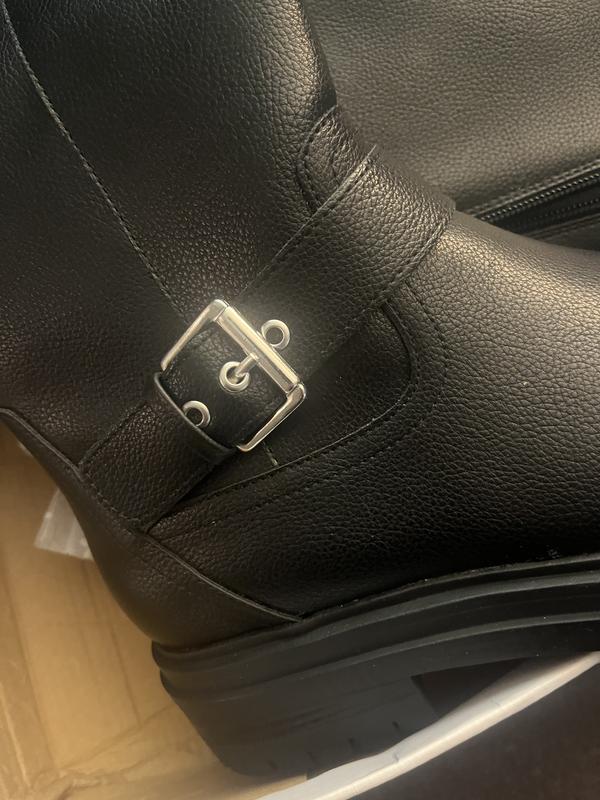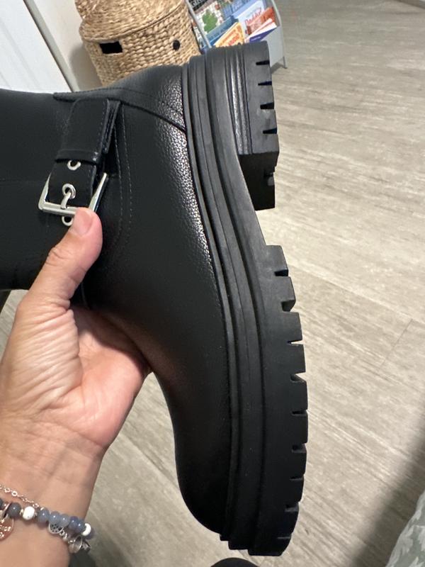 The bottom of the boots is more like platforms, which is what I wanted because my feet hurt me. It has 2 buckles that are nice. They are not real leather. I was able to get them on sale. For the price that I paid, I love them.