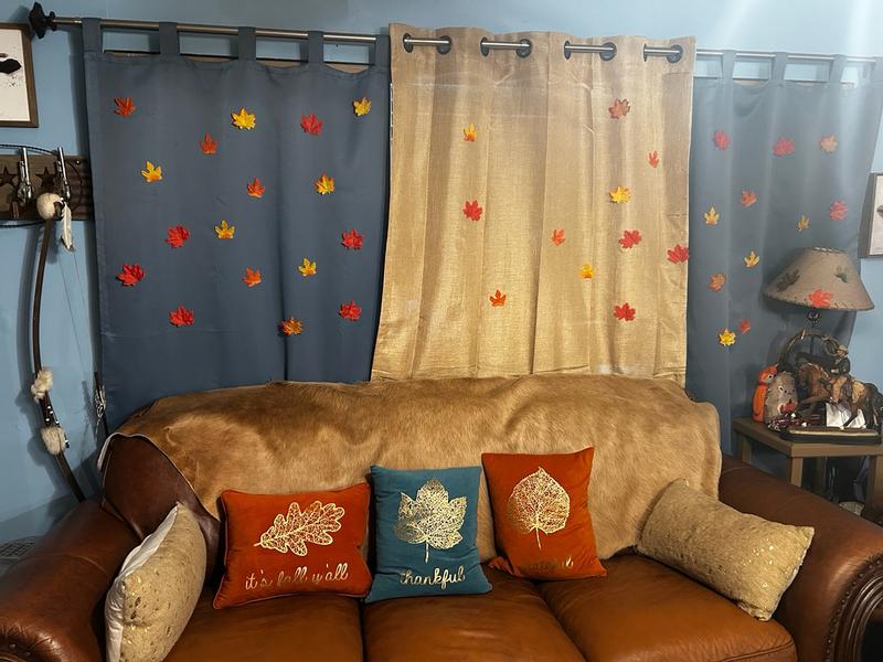 I’ve been really happy with these curtains. The quality is great and the fabric feels thick and durable. They block out light really well, which is exactly what I needed. The blue color looks just like it did online, and it fits nicely into my living room. I added some fall leaves to mine for seasonal decor, and the material held everything in place without looking weighed down. Overall they look nice, hang well, and do the job.