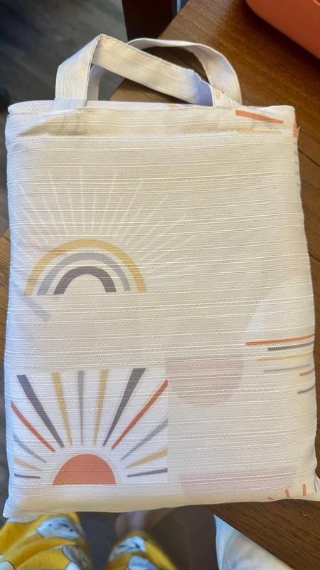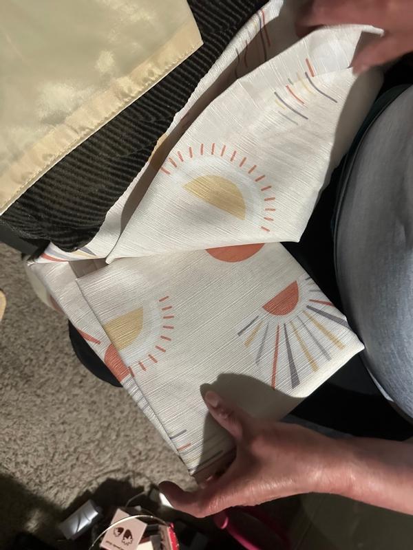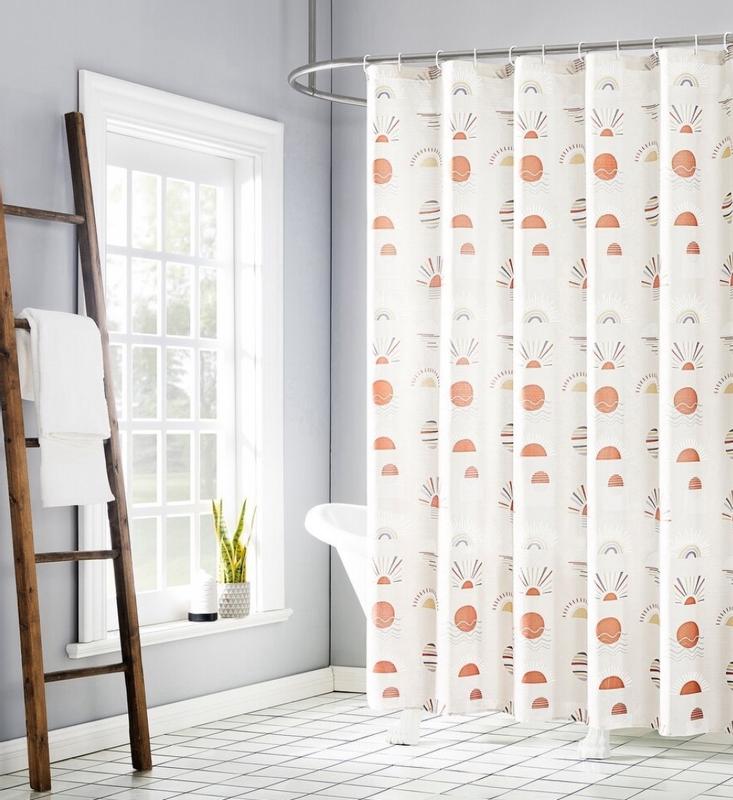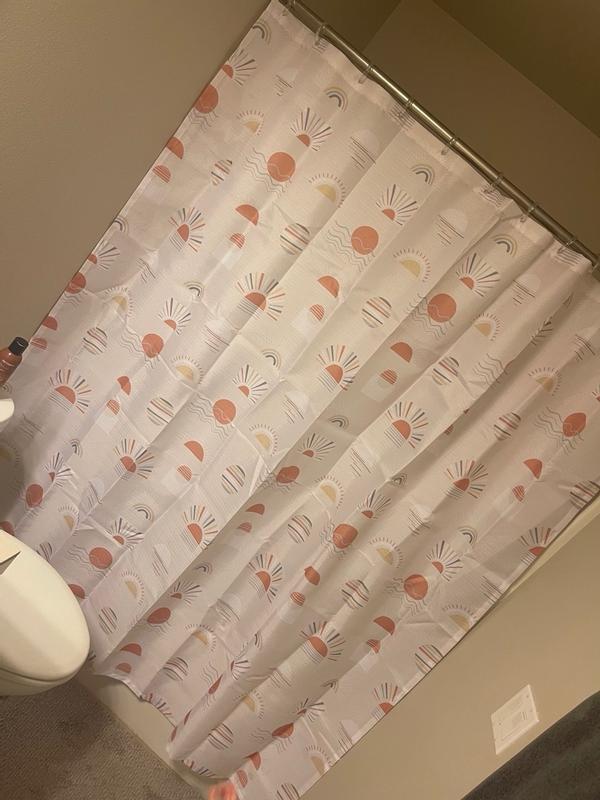 The Sunburst shower curtain comes in a set with white plastic rings (12) and a small matching bag. The fabric is very lightweight and feels like it would allow light through which is what I want for a small bathroom that doesn’t have a window. It does feel relatively good quality so I have no worries about the fabric, seems like it will deflect dirt better than a cotton fabric. The cute boho sun design is very subtle with just enough whimsy. This pattern would match a number of different decors and colors too.