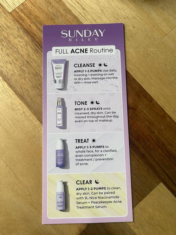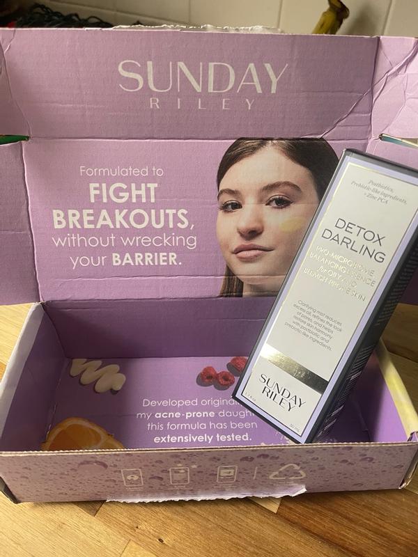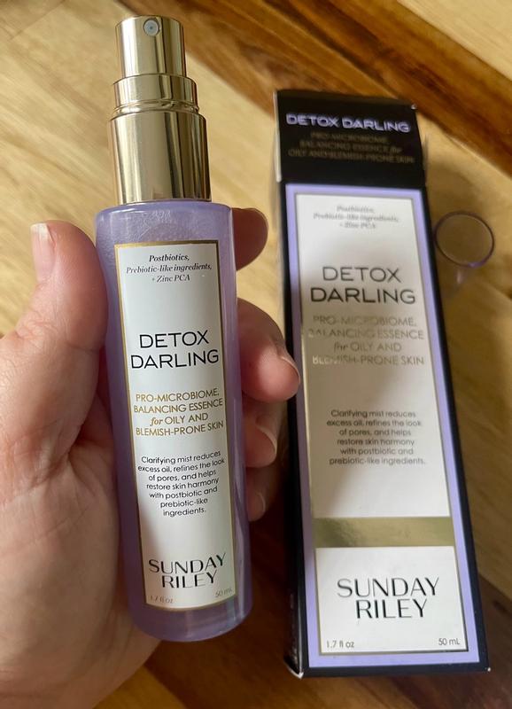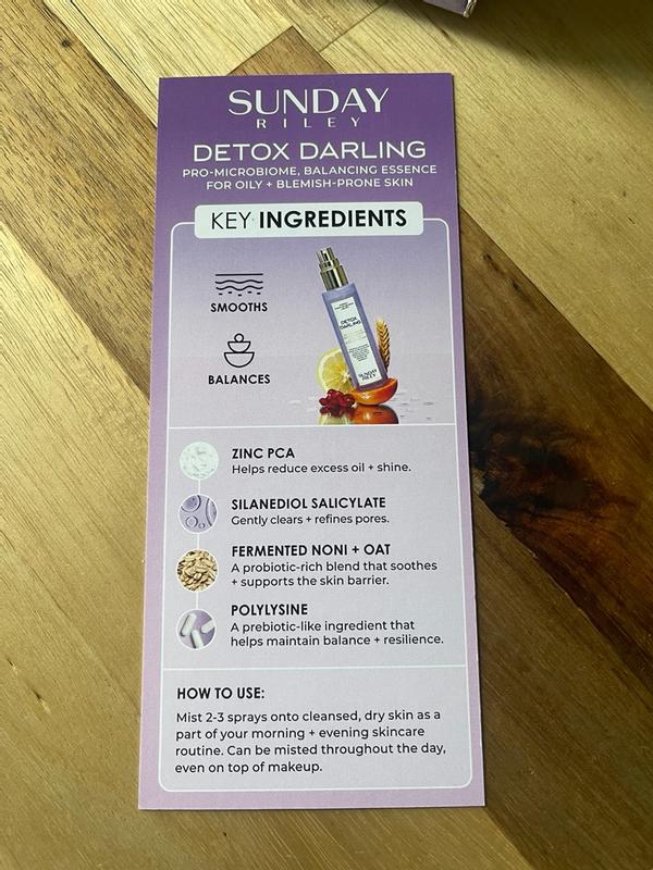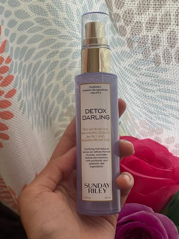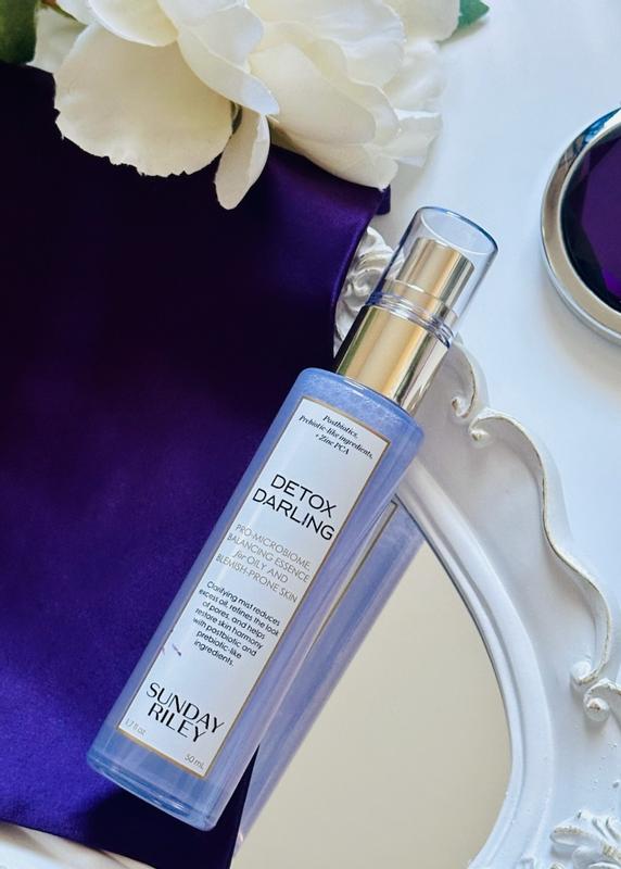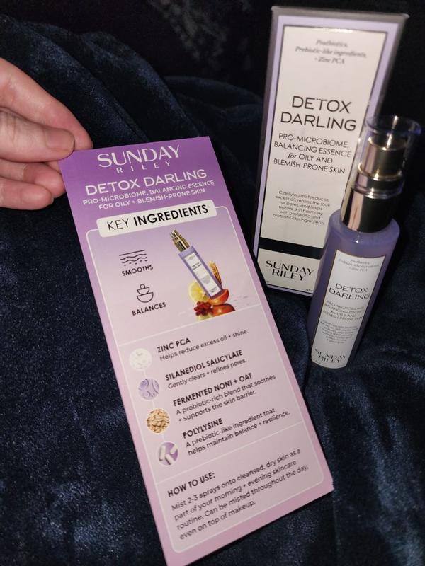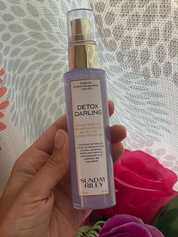 I absolutely love a Sunday Riley product and this detoxDarling balancing mist is no exception! It’s definitely meant for oily skin however so if u have drier skin this one is not for you. This comes in a pretty purple spray bottle that provides a nice mist only needing about two pumps. I use this after I wash my face but before my serums. I find this provides a nice base for my skin prep. It dries down quickly and you can feel it’s gonna do it jobs to combat oily skin. It works all day for me. There is no scent that I’ve noticed which I prefer for my face products it and no noticeable residue. I’m not sure overall about how effective it is for breakouts but the way it helps reduce oily skin it’s a win!