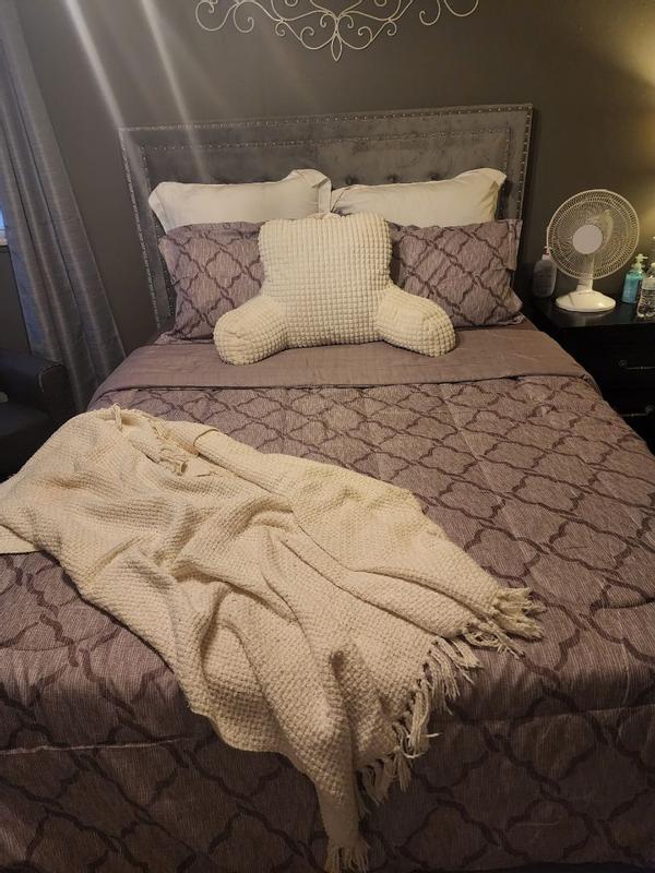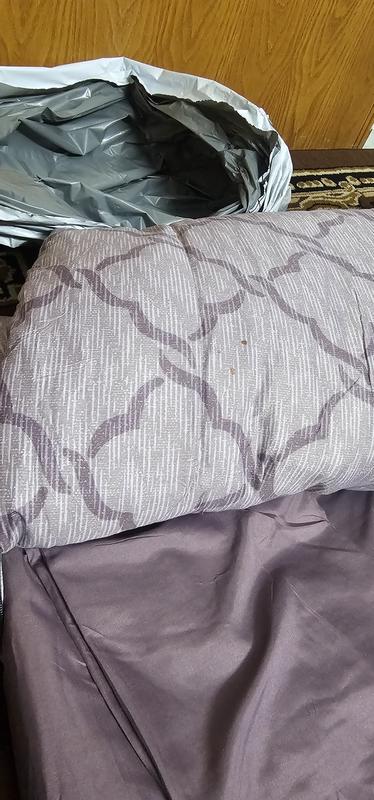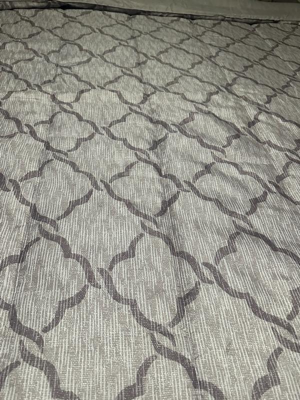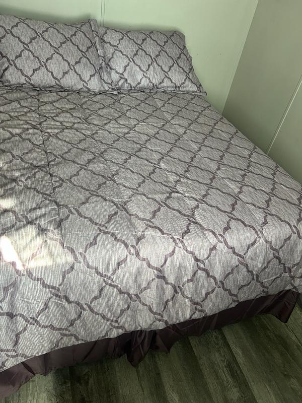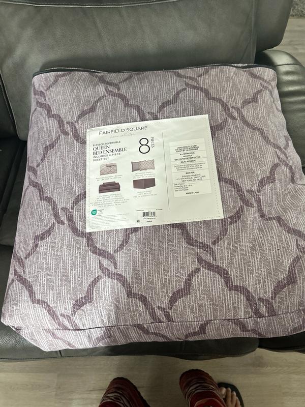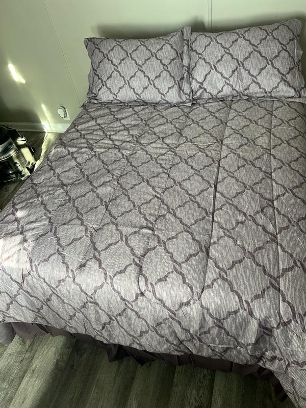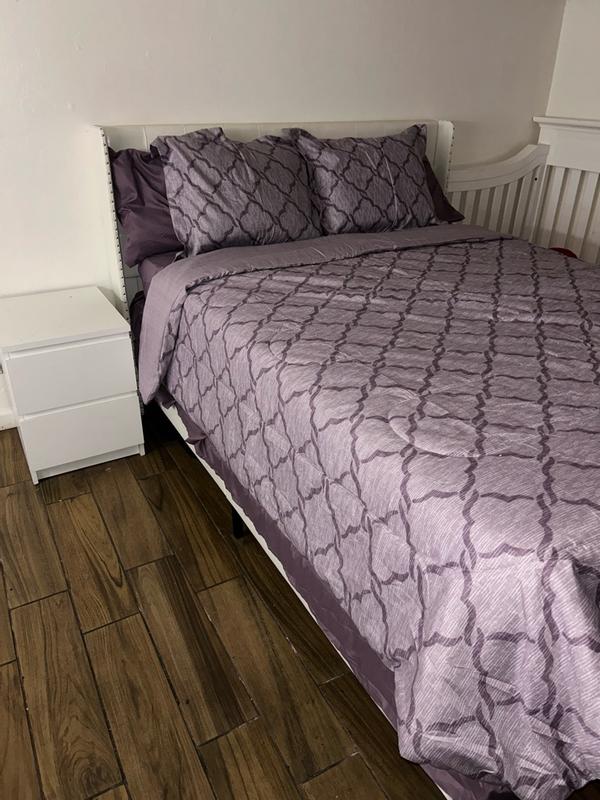 I received my Belvedere Comforter Set in Queen which included a flat sheet, fitted sheet, 2 pillow shams, 2 pillow cases, and a bed shirt. The design is super cute, I like the light lavender and the diamond shapes. The weight is light and allows air to flow while you sleep without you overheating. Reversible-just flip it to create a solid lavender without design. Easy to maintain by the feel, if you spill liquid it would easily be able to be cleaned up or easy to wash and dry. It goes great with my bed frame and the large decorative yellow pillows. I like bold colors together to bring out the product. I’m highly recommend this set for your bedding needs.
