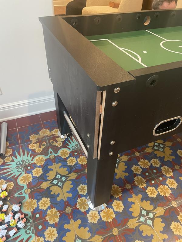 Challenge friends and family members to a match with this foosball game table. Anyone can play, making it a great option for family game night or friendly competitions. This sturdy game table is sure to be the center of a rec room, basement, or den. The durable steel rods smoothly glide to control the plastic players with precision, and the molded handles are comfortable to grip and turn. It's easy to position the players and "kick" the ball. The plastic players wear jerseys of yellow or white with black shorts. The field is made of laminated MDF and is painted to resemble a soccer field with green grass, a center starting circle, and white boundary lines. Use the manual scorers on each side of the table to keep track of the score. This table also features two built-in drink holders to keep beverages on hand.
