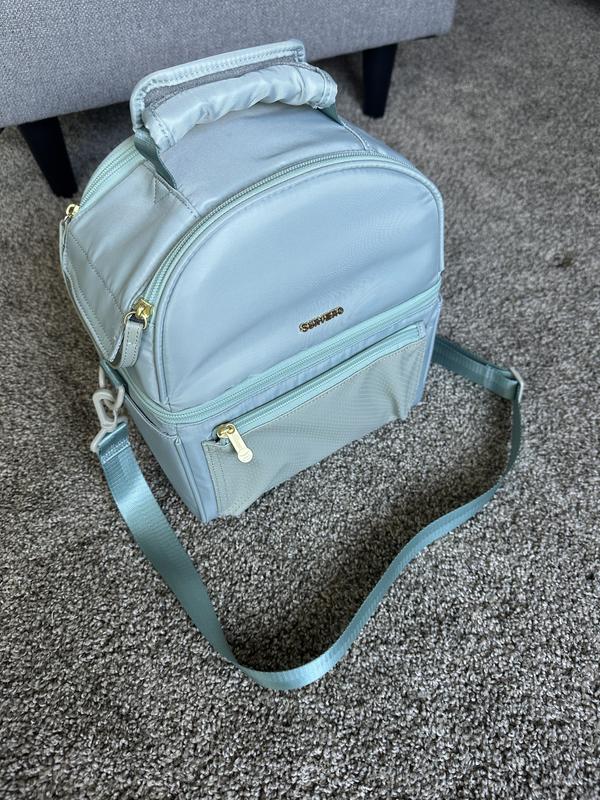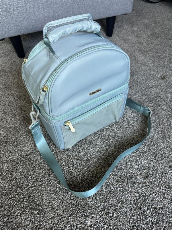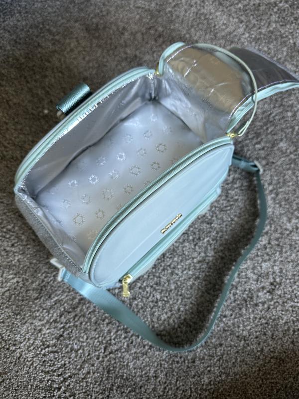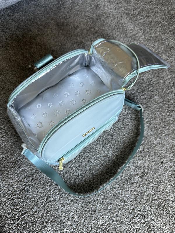 I went with the green color and it’s so cute and stylish!! I love that the bottles I use will fit in it perfectly and they won’t roll around since they tuck snugly into the holder. I like the top pocket where I can put an ice pack or two. Functional meets cute!!