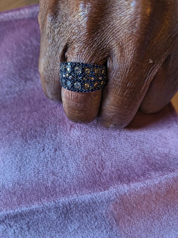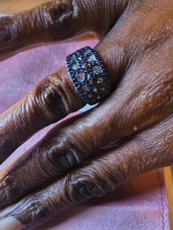 I purchased this ring as a birthday gift to myself. It arrived very quickly and was well packaged. Love the color, as blue is my favorite. Nice width and size was good. Gets many compliments from my friends. Really like Suzy Levian and have several pieces. Beautiful and not so overly pricey.