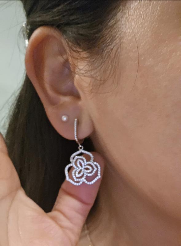 These earrings are lovely! I purchased them for my son’s wedding this fall. They are delicate, yet substantial in size. Perfect for dangling and will be perfect with my dress. Length of the earring is about 1.5” and 0.75” at the widest point of flower. Wish that the description online would have shown these dimensions but I took the chance and ordered them and love them!