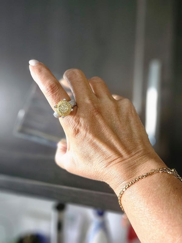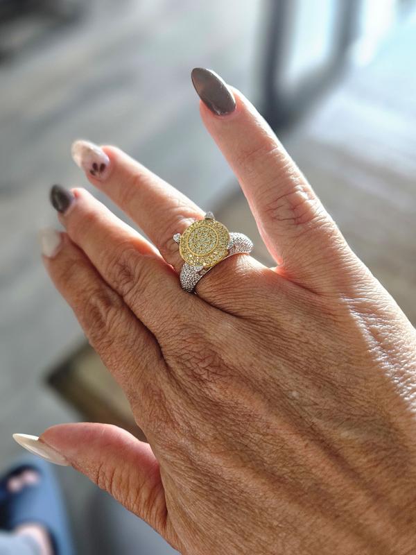 Second purchase from Suzy Levian. Does not disappoint! Purchased yellow stone so I can wear with different jewelry, and it is beautiful. It is more of a statement ring which is something that I always look for in a ring. Purchased Size 9 so I can wear on different fingers. Love, love the ring.