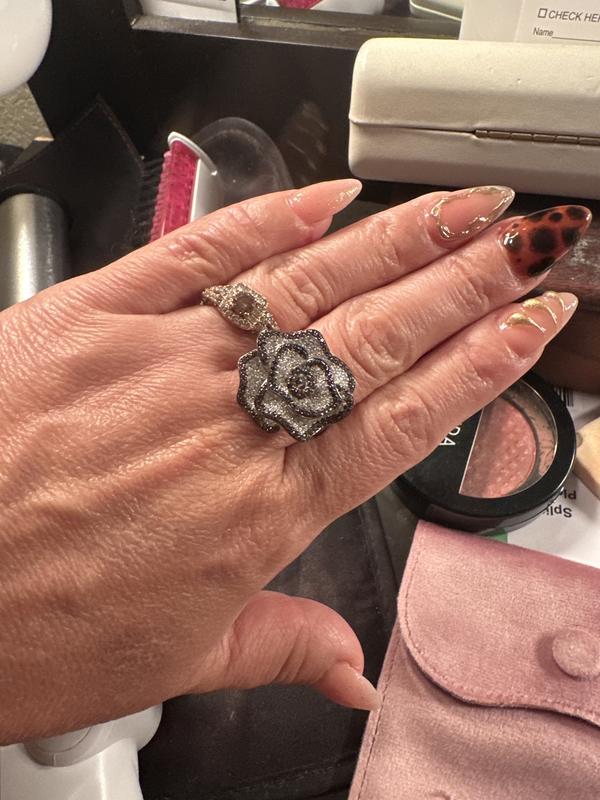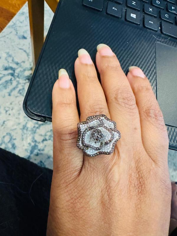Delightful ring. Just the right dimension - not small, yet not overpowering. It has just the perfect amount of sparkle and dazzle! The mocha stones definitely highlight the design of the petals and bring out the luster of the clear stones Your ring will be noticed, and you will be very pleased with your purchase. It will last forever and won’t wilt after a few days !!