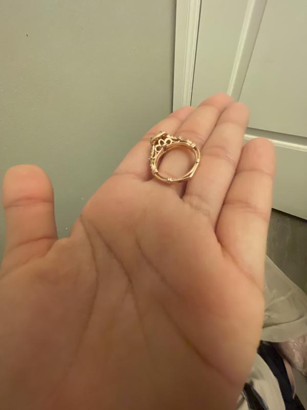 The ring is beautiful in the photo but once I wore it, I realized how it’s too expensive but feels cheap on my skin. It also looks that way because it’s not plated in rose gold. if it was it would a have a different shine to it, but it looks like a Toy ring.