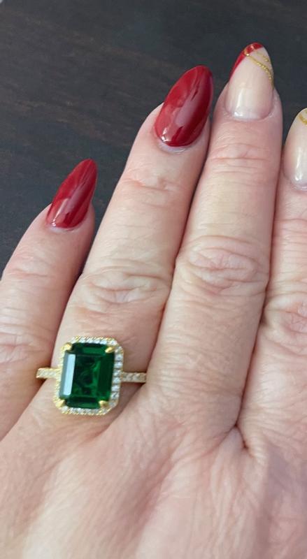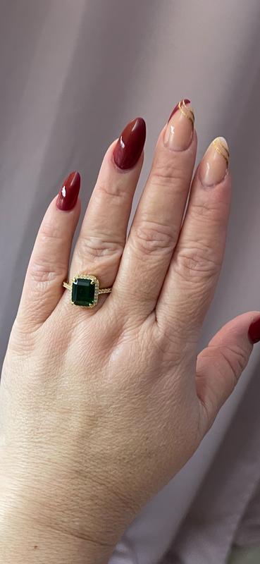 This beautiful emerald ring has a deep green stone in a soft cushion shape, surrounded by a circle of tiny diamonds that add extra sparkle. The thin band makes it comfortable to wear every day. The color is rich and natural, giving it a classic, elegant look. It’s a lovely statement piece that’s sophisticated without being over the top. I absolutely love it!