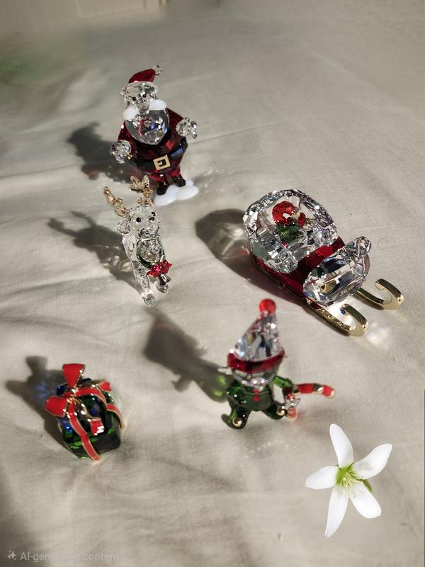 Create the ultimate scene of festive magic with this collectible Santa story set. The display includes Santa and his sleigh, together with a reindeer, a charming elf, and ribbon-tied gifts, all brought to life in a variety of colors and precision-cut facets. Champagne gold-tone metal is also used to add a luxurious touch to the details. The full set is delivered inside a special presentation box celebrating Swarovski's 130th anniversary. Decoration object.