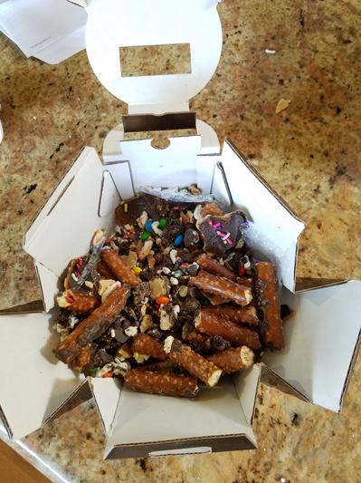 Cute to look at. But not flavorful. Pretzels seemed stale, but the product was NOT expired. It broke up into a mess. Could grab some pieces with our fingers, but otherwise better served by using a spoon. To me it is a gift you would give to someone for whom you couldn't think of anything else. Excessive wasteful packaging including the mallet, what would anyone want the mallet for afterwards? Sorry, cannot recommend.