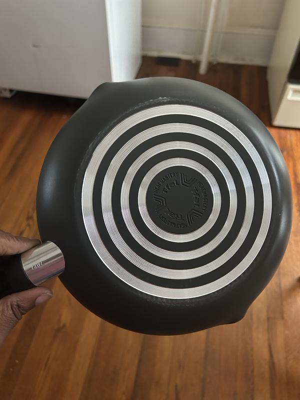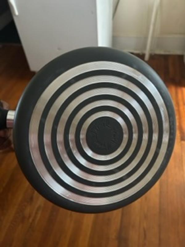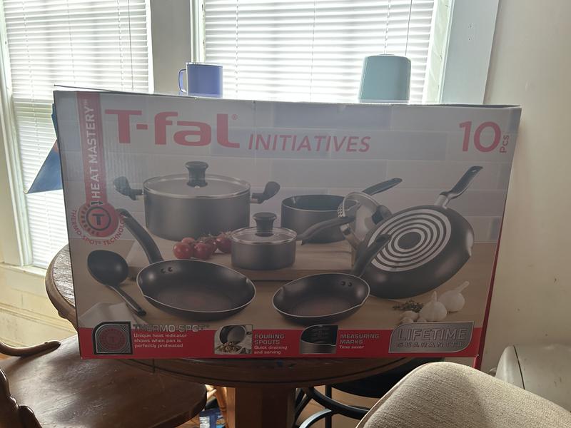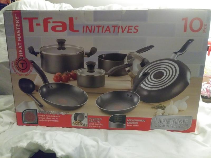 I recently got the ten piece initiatives cookware set by T-fal. We are so pleased. Food does not stick, you can wipe it clean with a paper towel! It's that easy. I love the dark color of this set. Handles are nice and large, don't burn fingers. You can go from cooktop to oven...my favorite! Easy to use, easy to clean. Great kitchen set!